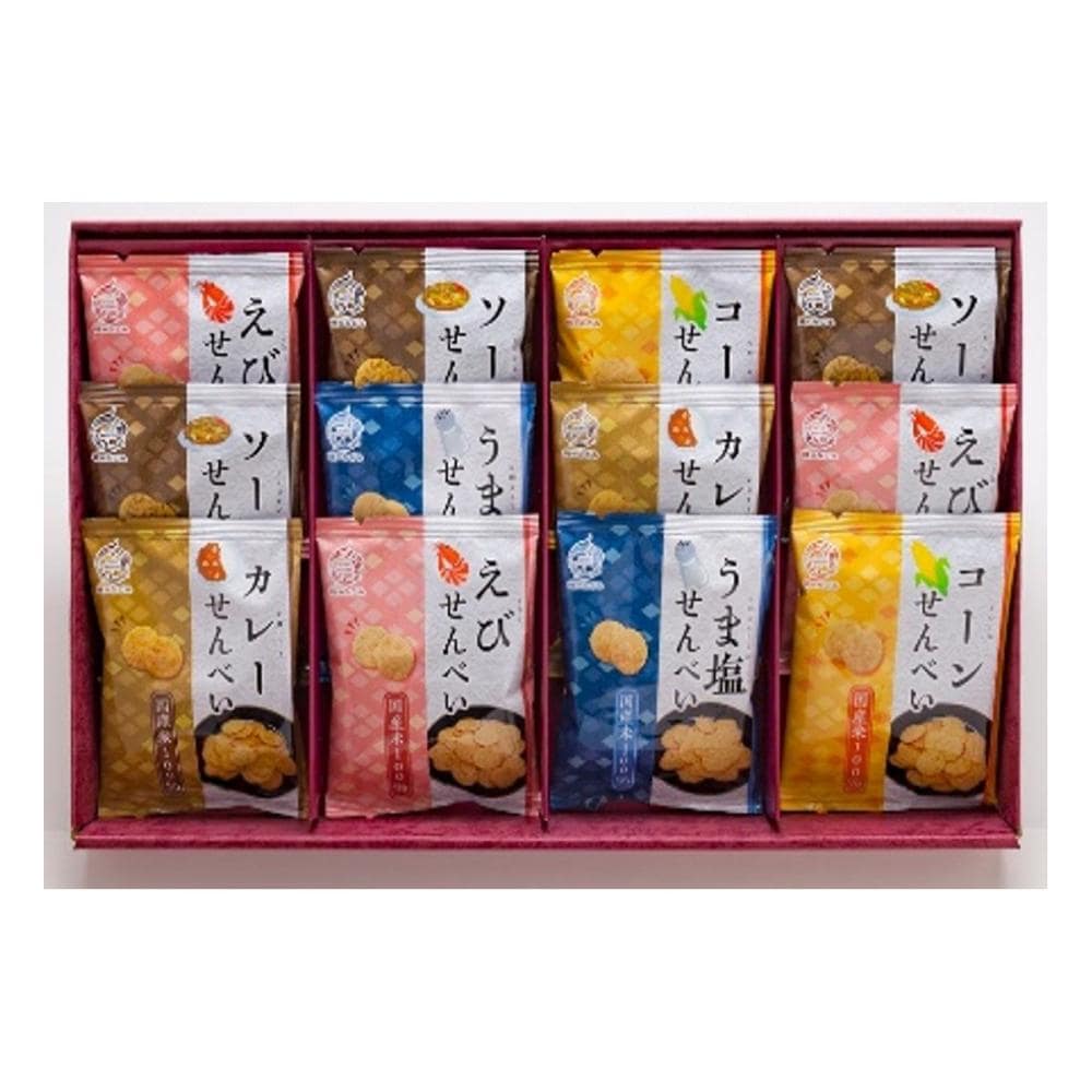 国産米を100%使用しカリッと口いっぱいに広がる香ばしいえびの風味で後引く旨さのえびせんべい、スイートコーンの甘さが引き立つ、香ばし醤油仕立てのコーンせんべい、せんべいの生地にあおさ海苔を練り込み磯の香り、ソースの旨み、酸味、懐かしさを堪能できる味に仕上げたソースせんべいなどをセットした米菓詰合せです。