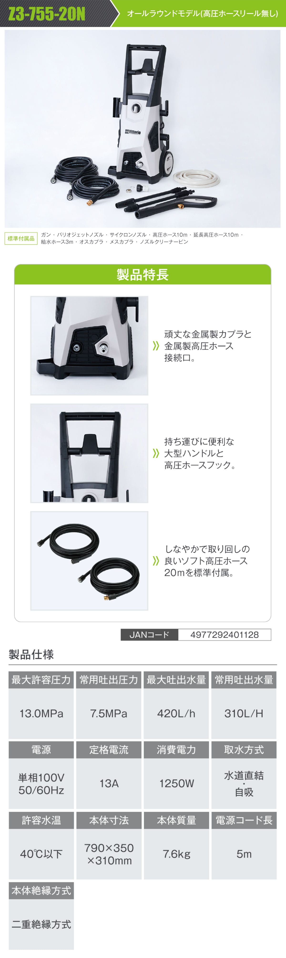 "●タイヤ付きで持ち運びに便利 ●水道洗浄の圧力約18倍 ●高圧ホース20m付属 ●誰でも簡単接続出来て、楽々洗浄 ●柔らかく折れにくいソフトホース"