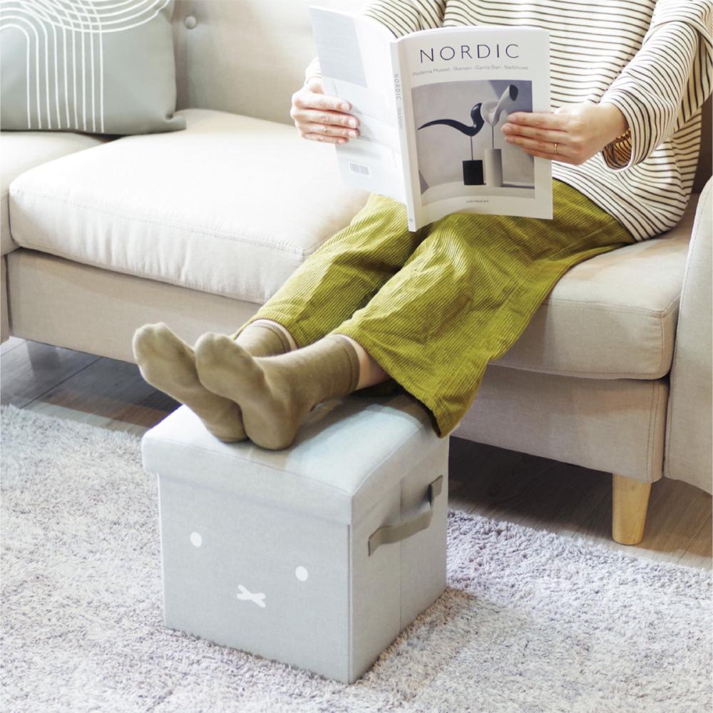 レザーハンドル付きで持ち運びラクラク。ソファのそばに置いてオットマンとしても使えます。