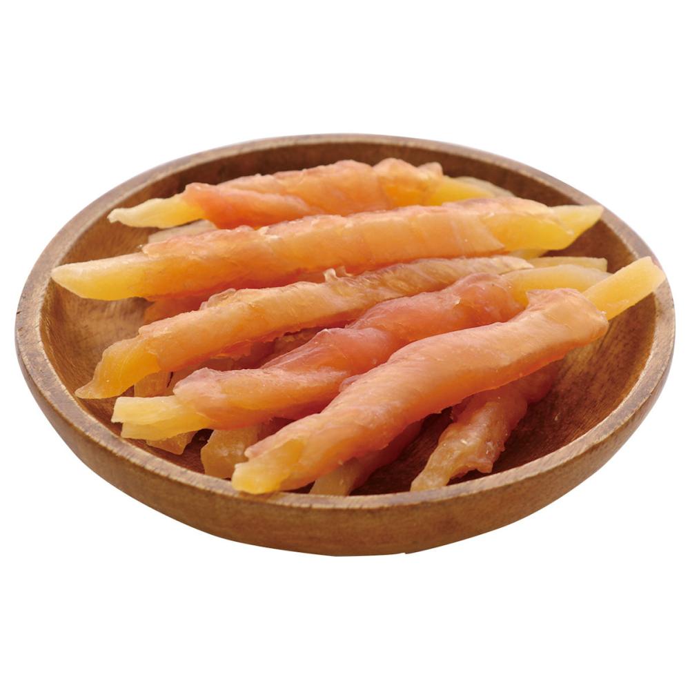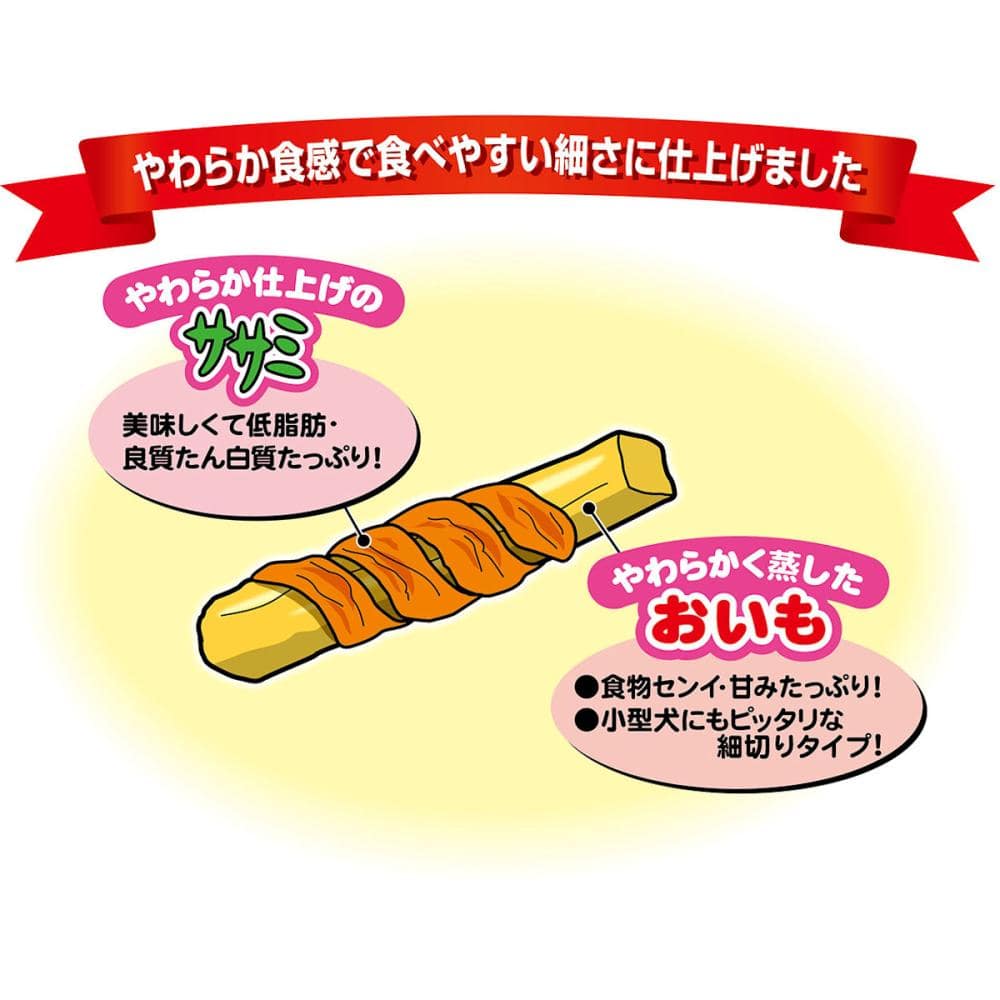 食物センイたっぷり細切りおいもに低脂肪な鶏ササミを巻いて小型犬にもぴったりなやわらかさ・サイズに仕上げました。
