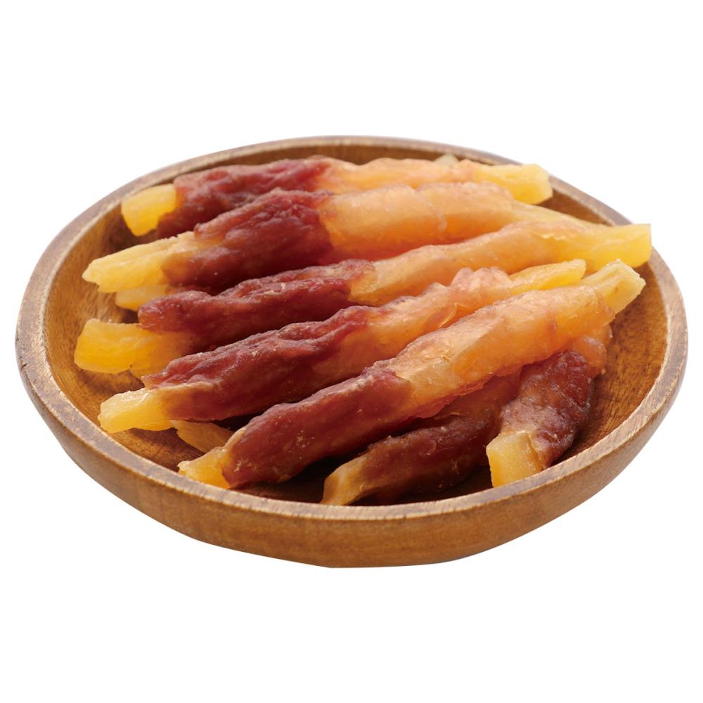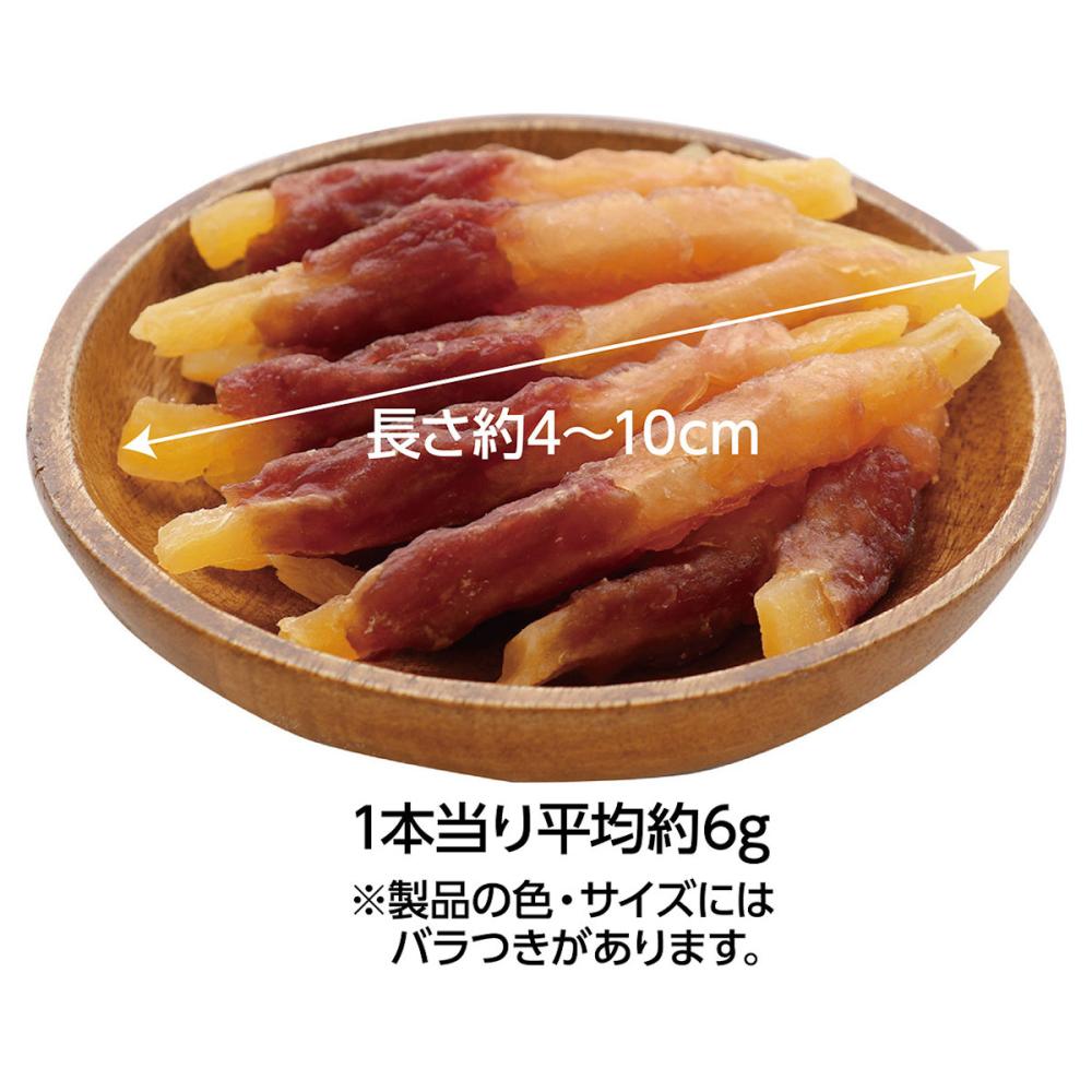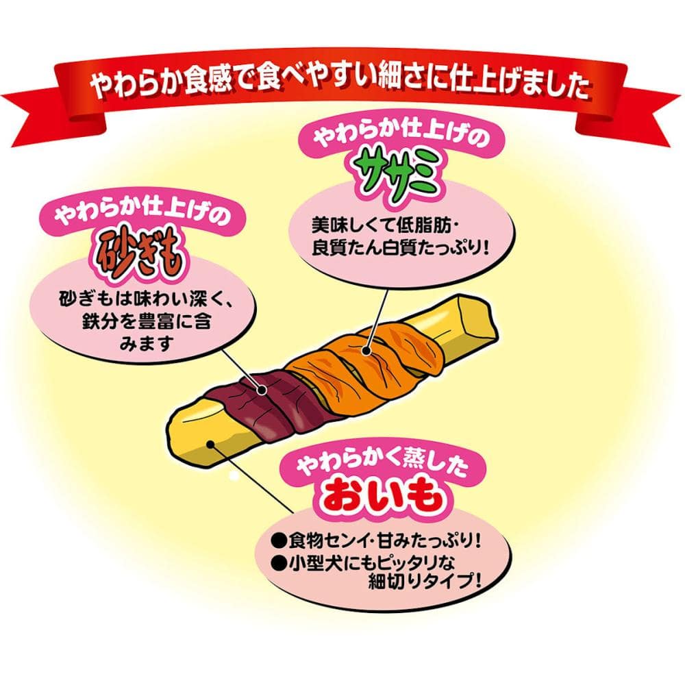 食物センイたっぷり細切りおいもに低脂肪な鶏ササミと味わい深い砂ぎもを巻いて小型犬にもぴったりなやわらかさ・サイズに仕上げました。