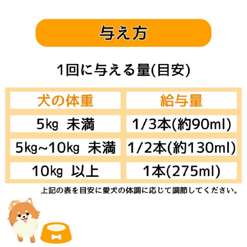 商品の利用(調理)方法:1回に与える量の目安は、犬の体重5kg未満は3分の1本、5kgから10kg未満は2分の1本、10kg以上は1本。