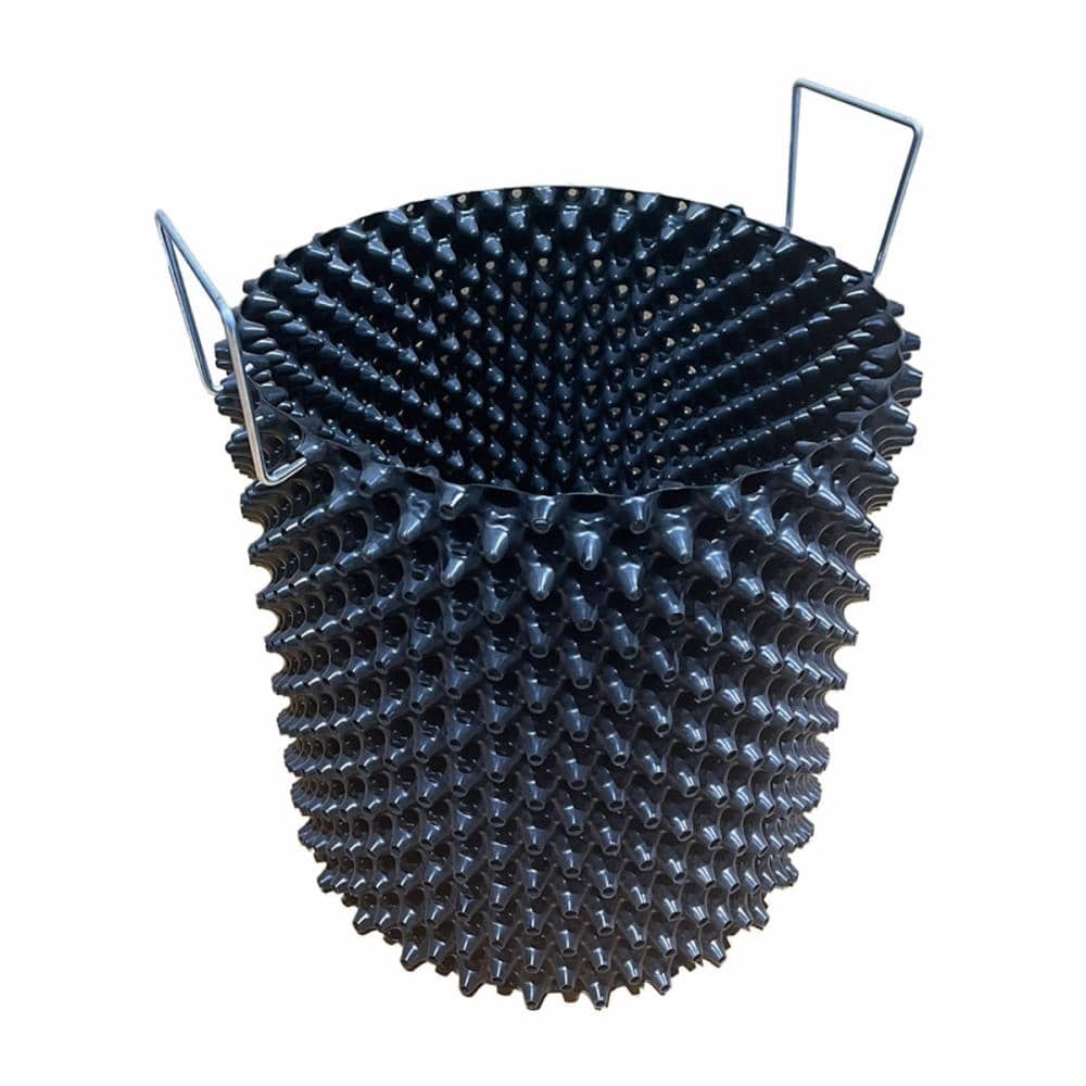 ※お客様組み立て品です。 ●側面の無数の穴から根が出てきて自然に枯れ落ちて剪定され、鉢内は多くの細根が育ちます。 ●ピンを外せば分解でき、また組み立てして繰り返し使用が可能です。 ●組み立て前は板状なので、少ない場所で保管可能です。 ●特殊素材と特殊加工により約10年以上繰り返し使用可能です。切断できるので、捨てる際も手軽です。