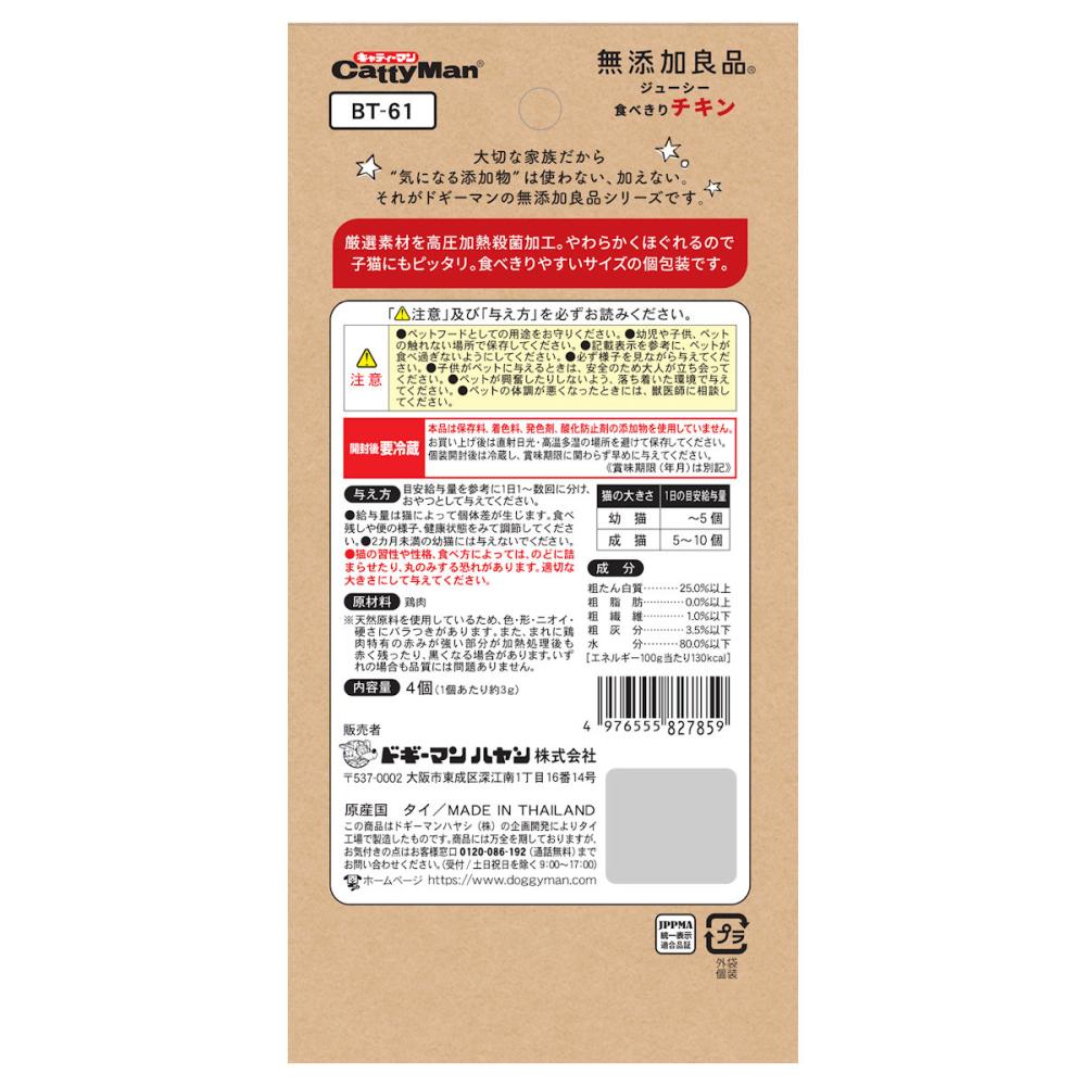 やわらかくてジューシー、ほぐしやすくシニア猫や子猫にもぴったり。素材そのままのおいしさ。食べきりサイズの個包装。手を汚さずにも与えやすく、使い切れて便利。保存料・着色料・発色剤・酸化防止剤不使用