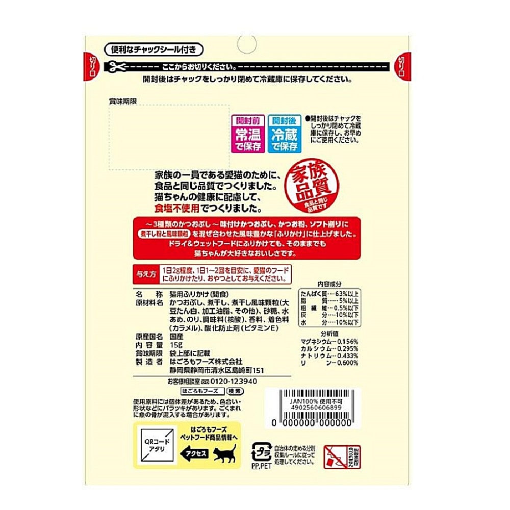 原材料・成分:かつおぶし・煮干し・煮干し風味顆粒(大豆たん白、加工油脂、その他)・砂糖・水あめ・のり・調味料(核酸)・香料・着色料(カラメル)・酸化防止剤(ビタミンE)