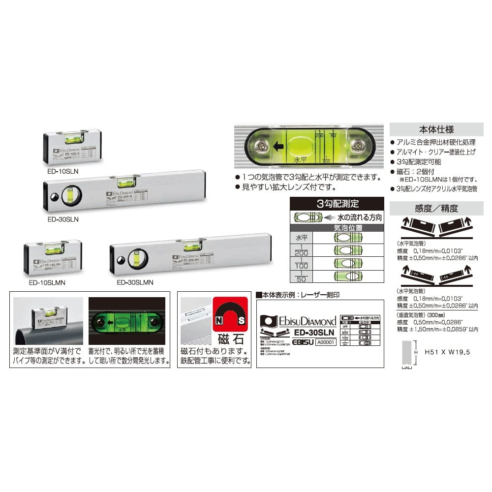 ●機能説明 ・3勾配(1/50・1/100・1/200)と水平が測定出来ます。(ED-30SL(M)Nは垂直も測定可能) ・拡大レンズがつき、大変見やすいです。 ・V溝付き測定面でパイプ測定可能です。 ・蓄光付で明るい所で光を蓄積して暗い所で数分間発光します。 ・磁石付きで鉄配管工事に便利です。 ●本体仕様 ・(水平気泡管) ・感度:0.18mm/m=0.0103° ・精度:±0.50mm/m=±0.0286°以内 ・(垂直気泡管)(300mm) ・感度:0.50mm/m=0.0286° ・精度:±1.50mm/m=±0.0859°以内 ・3勾配(1/50・1/100・1/200)測定可能 ・磁石:2個付 ・本体:アルミニウム ・樹脂カバー:ABS ・気泡管:アクリル樹脂(PMMA)