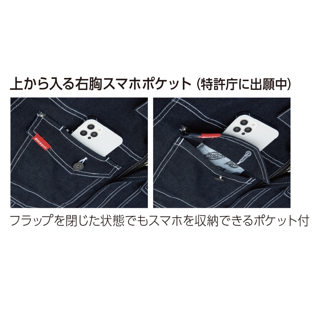 横の伸長率が25%以上あるストレッチ素材を使用したDickiesデニムツナギ