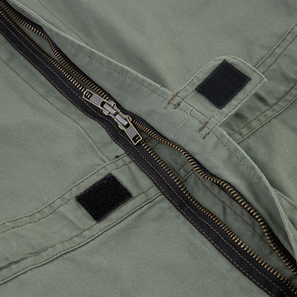 前ファスナーは上下どちらからでも開けられるダブルスライダーの逆開タイプ ウエスト周りを調節できる腰裏側ボタンアジャスター仕様