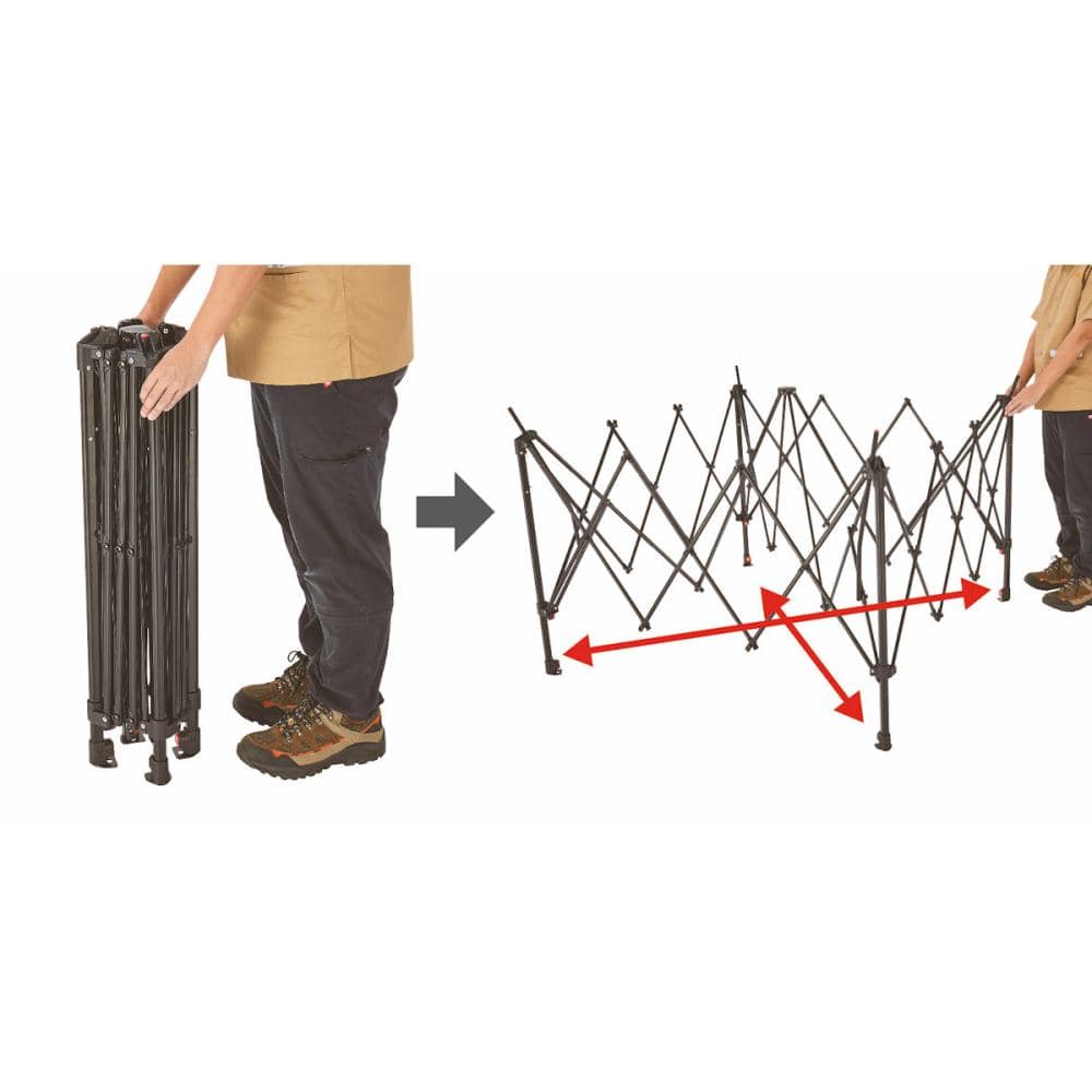 脚の節を増やし中に収納することで従来に比べ長さ約20cmコンパクト収納を実現 開くだけの簡単設営 コンパクト収納で異動や保管に便利 風に強く雨や日差しが入りにくいひさし型 耐水圧:800mm