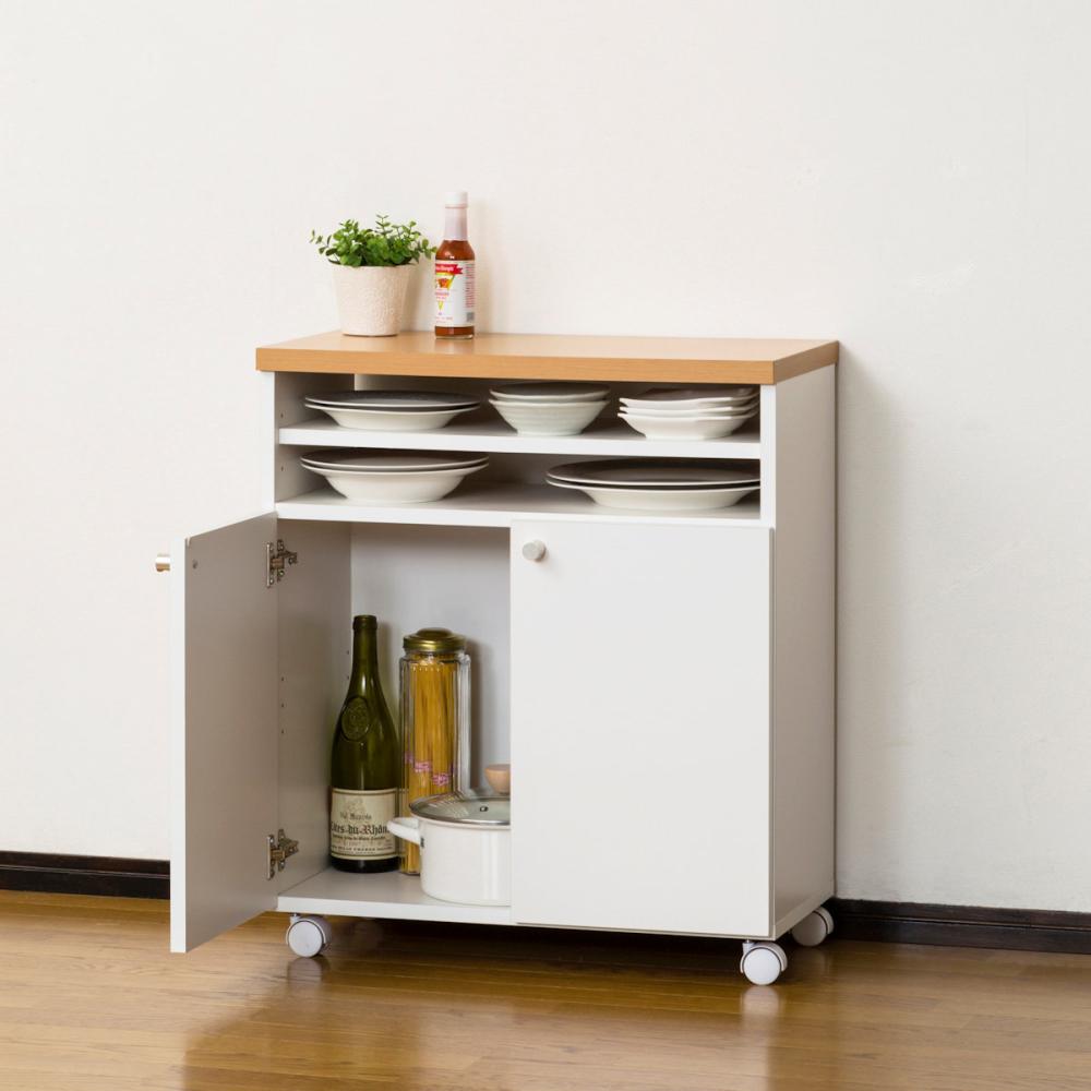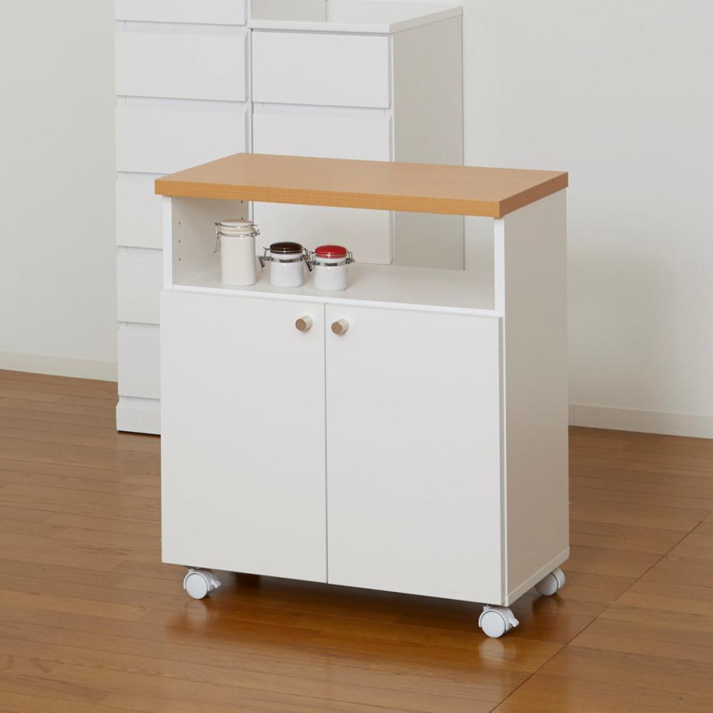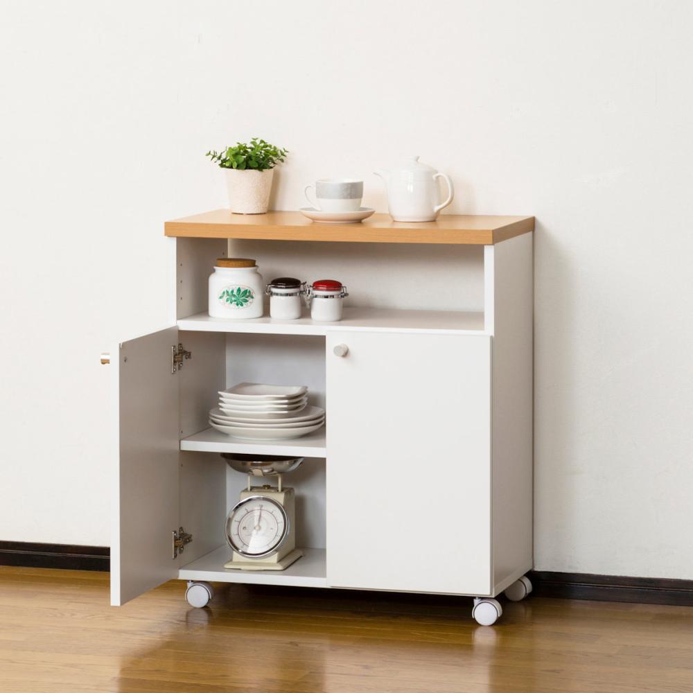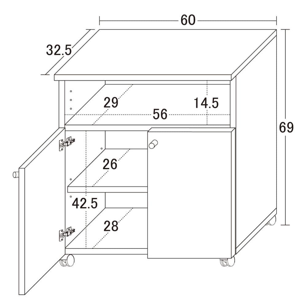 ■上部空間は背面オープン仕様。背面からも収納物を取り出せるのが便利です。 ■可動棚1枚は、収納物に合わせてオープン部または扉内に取り付けができ、収納の幅が広がります。 ■キャスター付ですので移動がラクラクです。 【サイズ】 幅60×高さ69×奥行32.5cm 【耐荷重】 天板:25kg 棚板:5kg 【材質】 プリント紙化粧繊維板 【原産国】 日本 ※お客様組立商品/必要工具:プラスドライバー