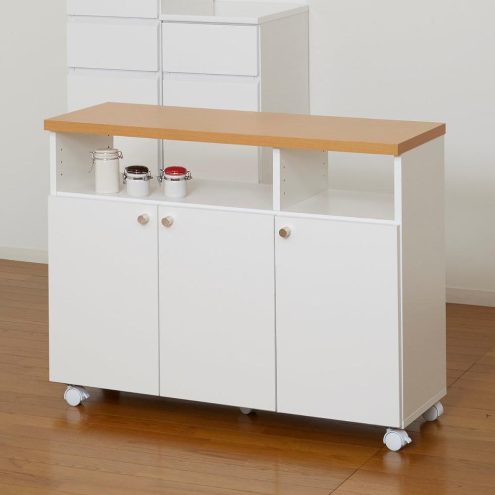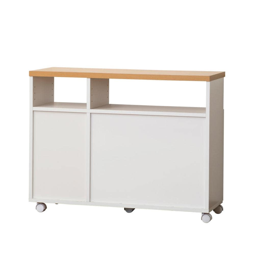■上部空間は背面オープン仕様。背面からも収納物を取り出せるのが便利です。 ■可動棚大、小各1枚は、収納物に合わせてオープン部または扉内に取り付けができ、収納の幅が広がります。 ■キャスター付ですので移動がラクラクです。 【サイズ】 幅90×高さ69×奥行32.5cm 【耐荷重】 天板:25kg 棚板:5kg 【材質】 プリント紙化粧繊維板 【原産国】 日本 ※お客様組立商品/必要工具:プラスドライバー