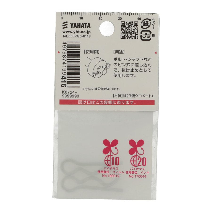【特徴】 ボルト、シャフトなどのピン穴に差込んで、回り止め、抜け止めとして使います。 R形中央部が挿入される円筒部の半径に等しいものが適正サイズです。適正サイズを使うことによって使用中の離脱を防止でき、取付け、取外しが容易です。 材質は鋼で三価クロメートめっきがしてあります。