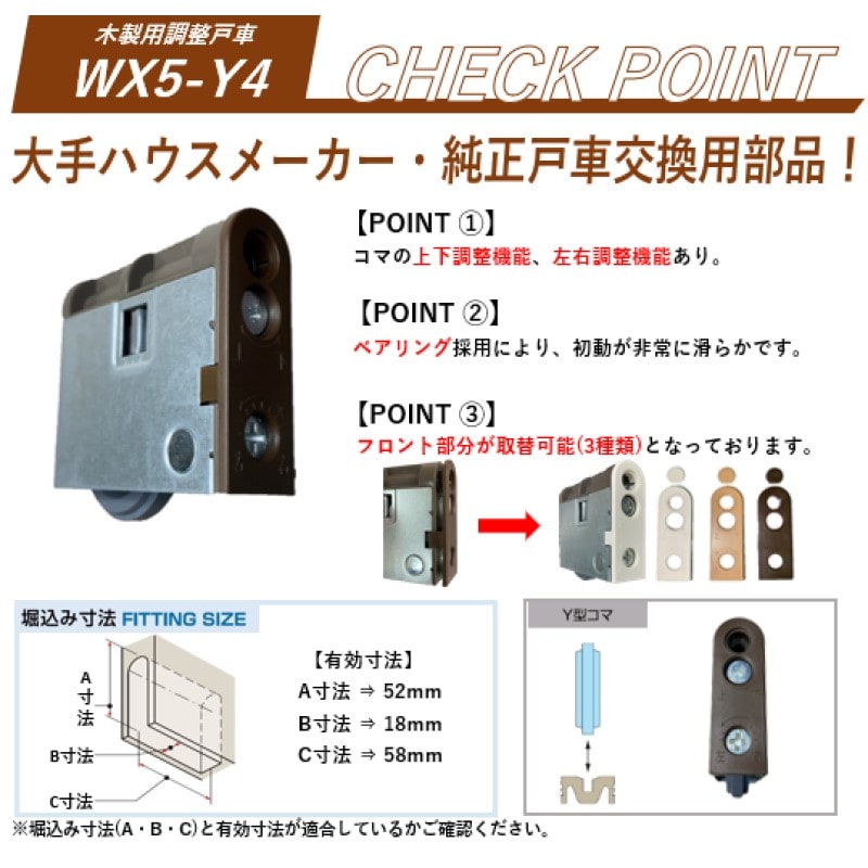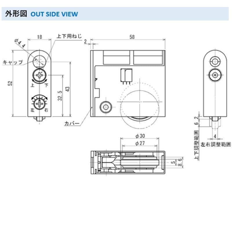 ●用途:室内引戸 ●取付け穴:43mm ●コマ形状:Y型(ツバ幅5mm以下) ●コマ直径:30mm ●レール形状:Y型(溝幅5mm以上) ●耐荷重:40kg(2個使用) ●材質:本体材質・ABS、鉄(スチール) コマ材質・POM