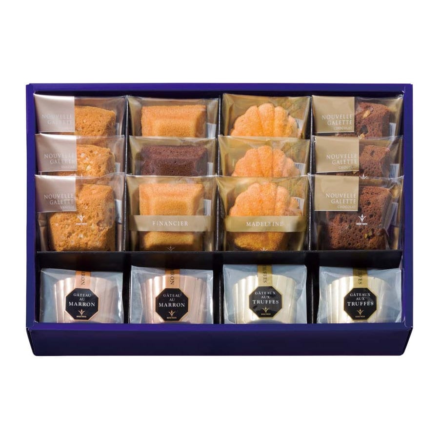 【セット内容】トリュフケーキ、ガトーオマロン、フィナンシェ×各2、マドレーヌ×3、フィナンシェ(ショコラ)、ヌーヴェルガレット(バニラ、チョコ)×各3