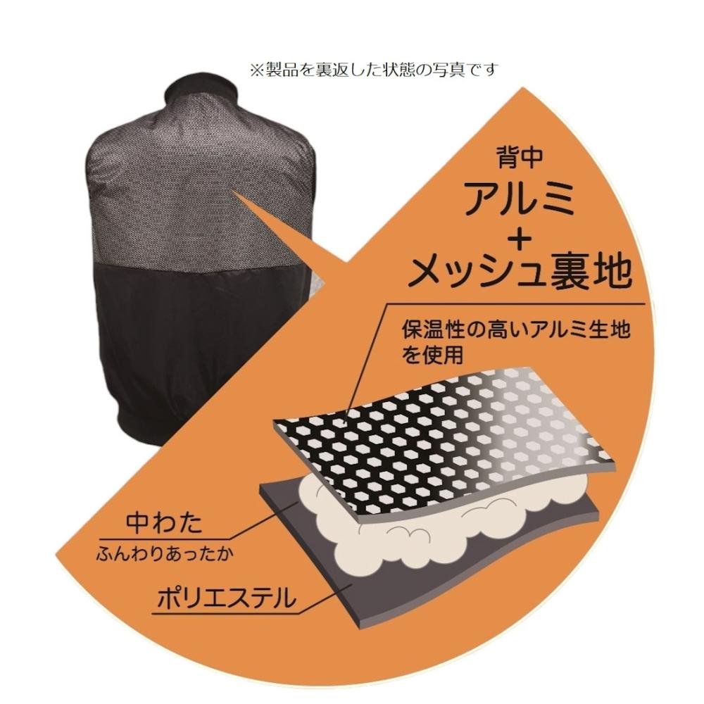 ●背中の裏地にアルミ生地を使用、さらに中綿入りで保温効果アップで暖かい。