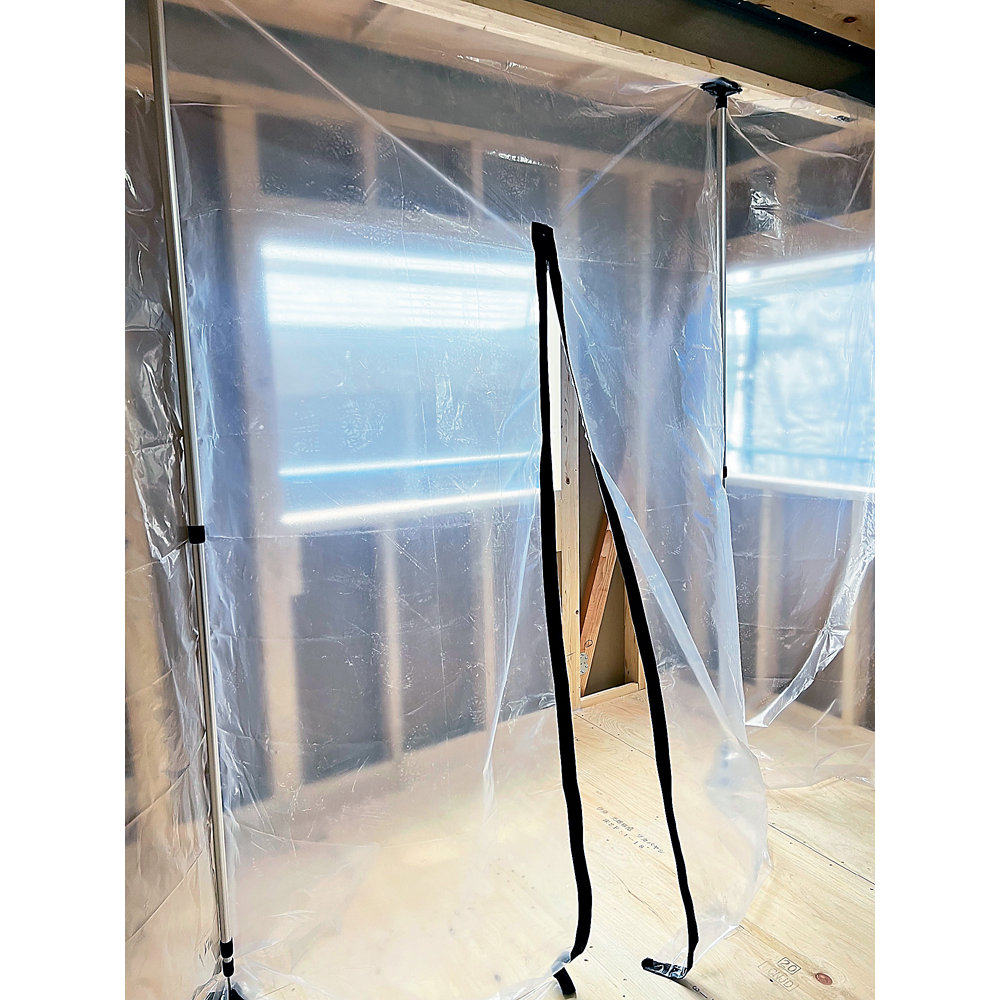 ●シートを挟んで簡単設置、仮設作業の頼れる相棒、防塵シリーズ用のサポートリフタです。 ●別売のシートとドアを組み合わせることで、ほこりや粉じんの飛散を防ぎます。 ●本体はアルミ製で丈夫で軽く、伸縮自在に天井と床の間を突っ張ります。