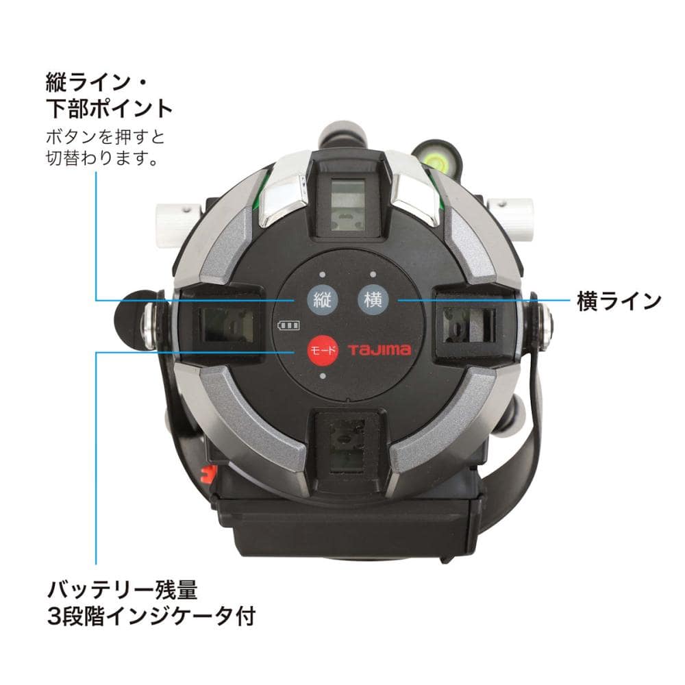 "●KYR高精度矩・横・両縦レーザー3WAYです。 ●鮮視度500の新世代シャープグリーン520nmラインです。 ●横ラインはワイド180°照射です。 ●手動でも精密な地墨合わせができる回転微調整機能付です。 ●本体に直接三脚の取り付けができます。 ●単3形電池アダプターボックス付です。 ●電源は別売のリチウムイオン充電池、ACアダプターでも使用できます。 ●頑丈なステンレス製キャリングケース付です。"