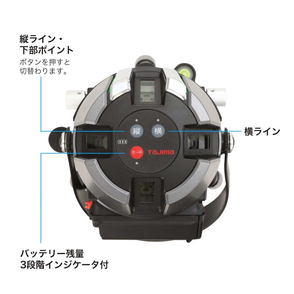 "●KJY高精度矩十字・横レーザー3WAYです。 ●鮮視度500の新世代シャープグリーン520nmラインです。 ●横ラインはワイド180°照射です。 ●手動でも精密な地墨合わせができる回転微調整機能付です。 ●本体に直接三脚の取り付けができます。 ●単3形電池アダプターボックス付です。 ●電源は別売のリチウムイオン充電池、ACアダプターでも使用できます。 ●頑丈なステンレス製キャリングケース付です。"