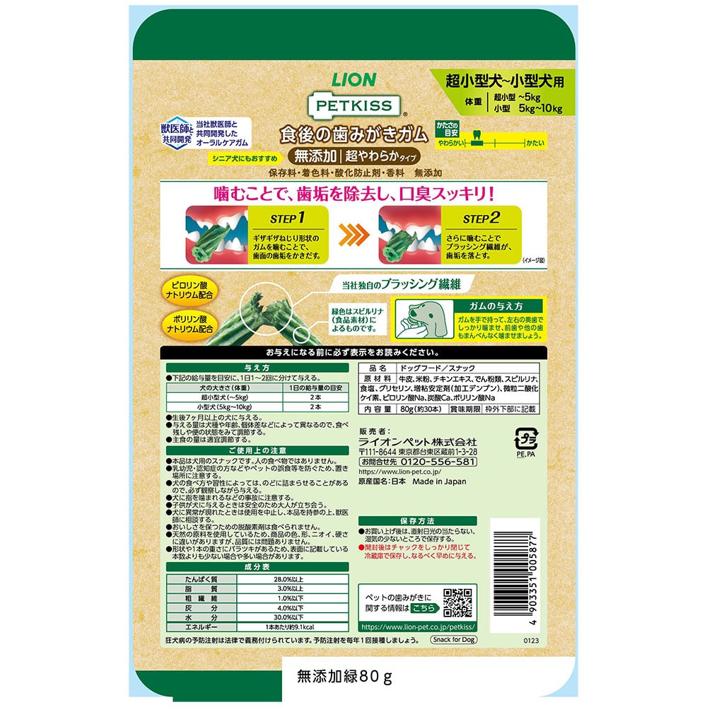 ライオン社獣医師と共同開発した歯みがきガム。当社独自のブラッシング繊維のガムをギザギザねじり形状に。