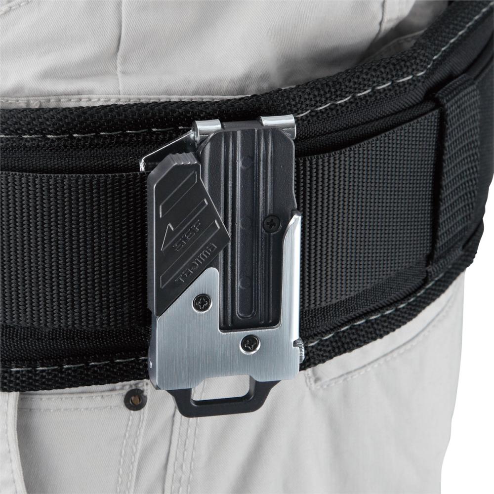 ●ベルトに後から装着できるネジ取付式。ゆるみ防止特殊加工ネジ採用 ●左手で取り出しやすい左ボタンタイプ ●強度重視の金属タイプ ●ベルトループを跨いで挿せるスペース活用設計 ●位置ズレしにくい横ズレ防止リブ構造 ●安全ロープ取付環付 ※通常幅のセフ工具ホルダー、セフワークライトは使用できません。