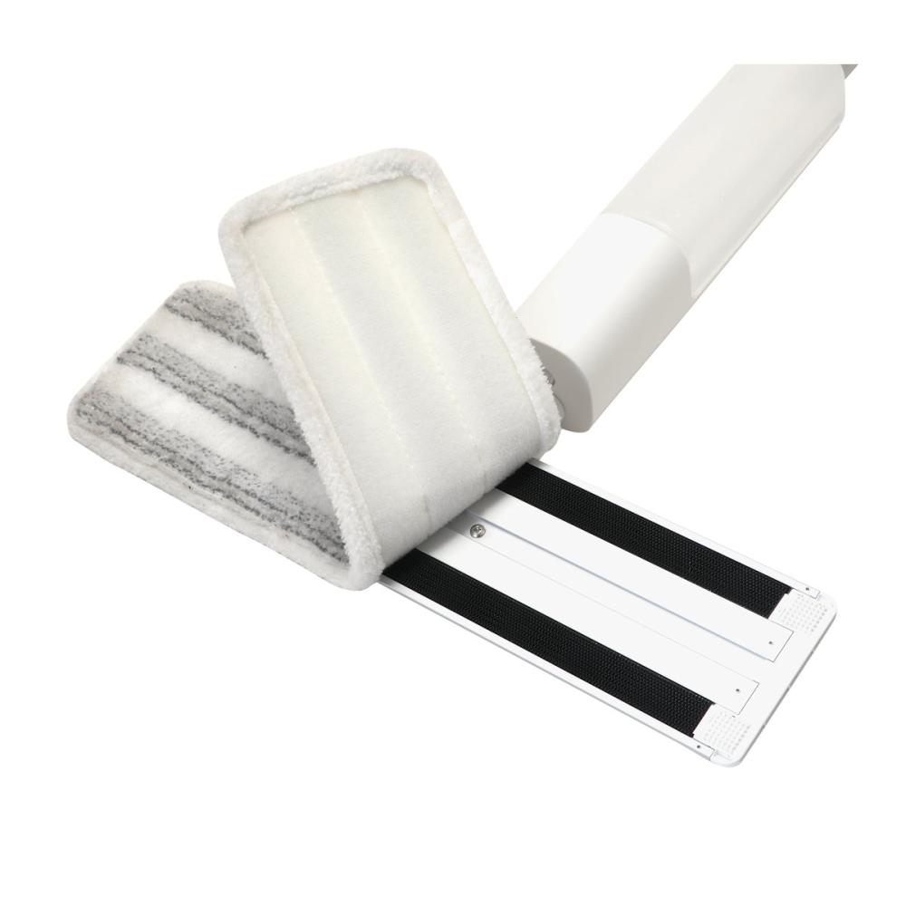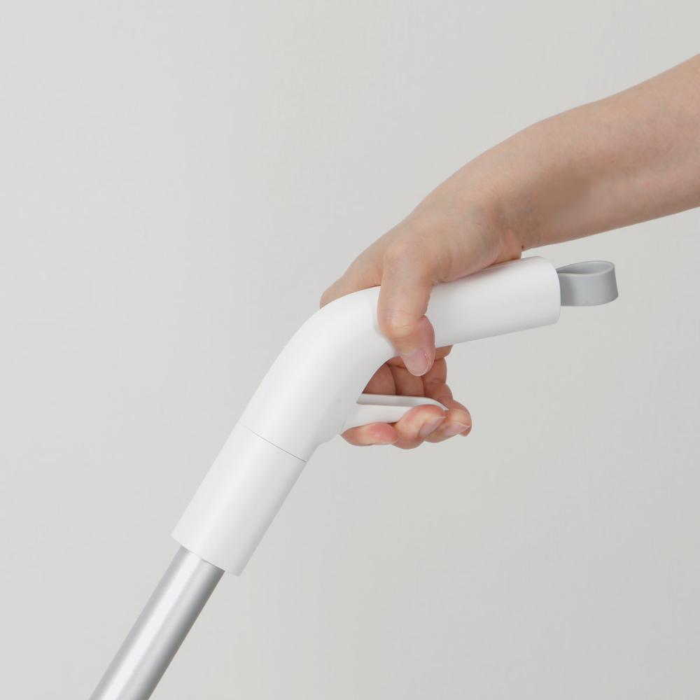 ■タンクに水を入れ、手元のレバーを握ると床に水を噴射。かがまずにワイドなモップで水拭きできる