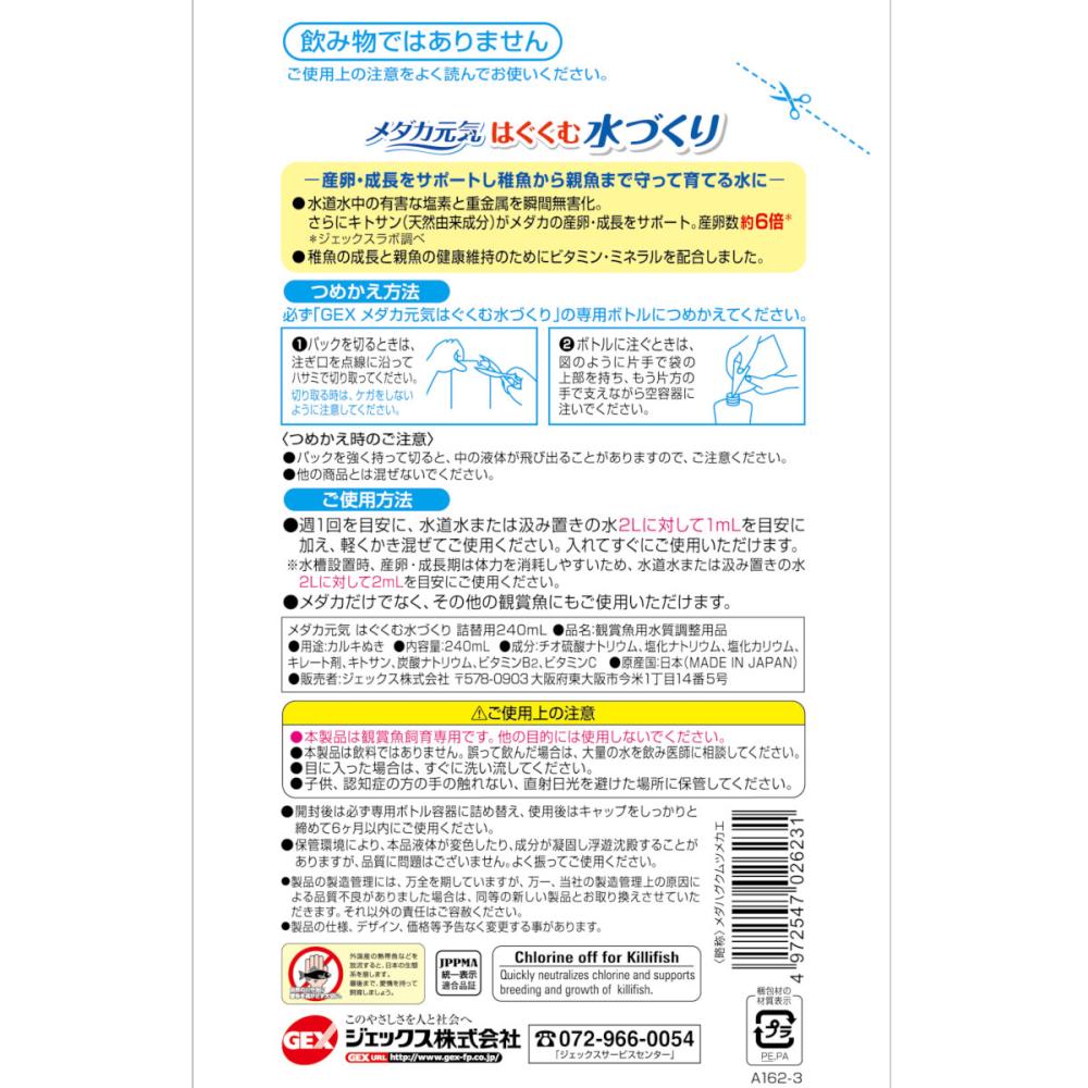 お取り扱い上の注意:●必ず「GEX メダカ元気はぐくむ水づくり」の専用ボトルにつめかえてください ●パックを強く持って切ると、中の液体が飛び出ることがありますので、ご注意ください。 ●他の商品とは混ぜないでください。〇塩素と重金属を瞬間無害化(カルキ抜き)〇キトサンがメダカの産卵・成長をサポート〇稚魚の成長と健康維持のためにビタミン・ミネラルを配合