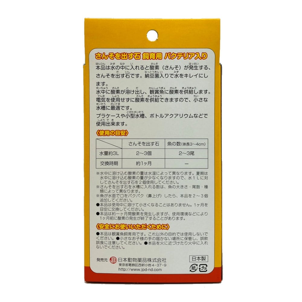 お取り扱い上の注意:●中~大型の魚には使用しないでください。酸素の供給量が不足し、酸欠になります。●海水魚・古代魚(アロワナなど)やナマズ類には使用しないでください。●甲殻類(エビ・カニなど)は水量の少ない容器で使用した場合、水質の変化によって体調を悪化させる恐れがありますので、こ注意ください。●本品を一度に大量に水中に入れると水質が変化することがありますので、ご注意ください。●分包から取り出した後は、すみやかにお使いください。●一度水に入れたものは、取り出して乾燥しても再使用はできません。●さんそを出す石は、エアーポンプの様に気泡を連続で発生させる製品ではありません。気泡は数日で消失しますが、酸素は水中に溶け込んでいますので、異常ではありません。●水槽に入れてから、約1ヶ月が経過したら水槽から取り出してください。●直射日光の当たる場所や高温・多湿になる場所に本品を置かないでください。 ●本品は観賞魚飼育用です。これ以外の目的では使用しないでください。●小さなお子様の手の届かない場所に保管し、誤飲誤食に注意してください。●本品を火に近づけたり火中に入れないでください