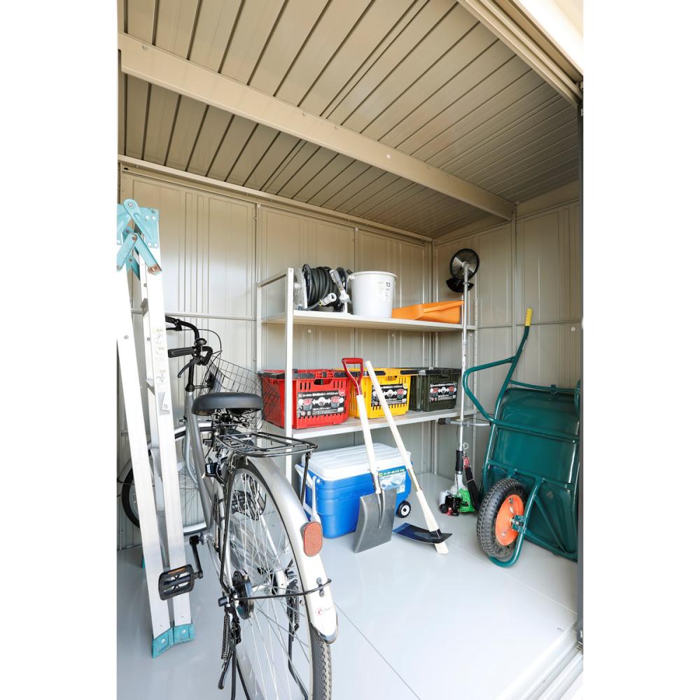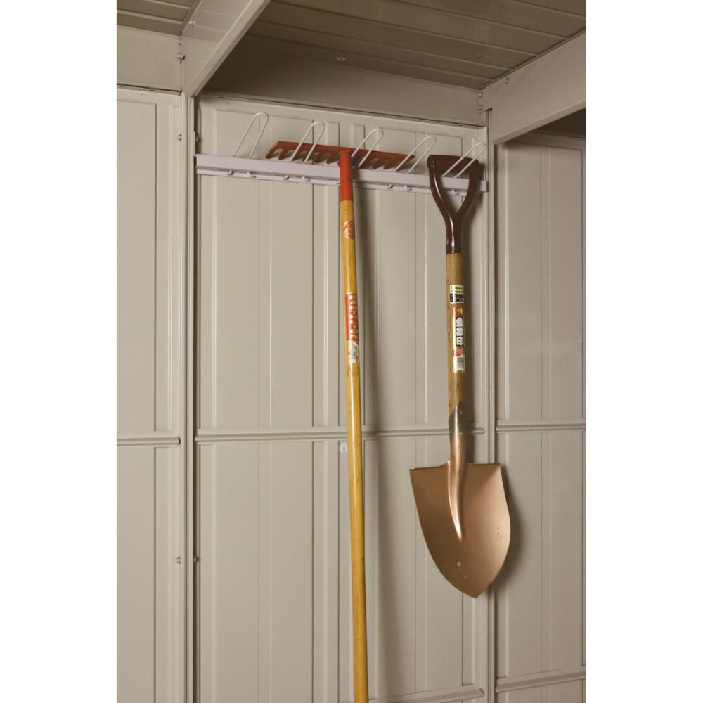 1 吊り下げフックを標準装備!!壁面部分も有効活用できるのでスコップなどの収納に便利