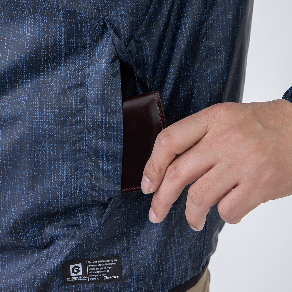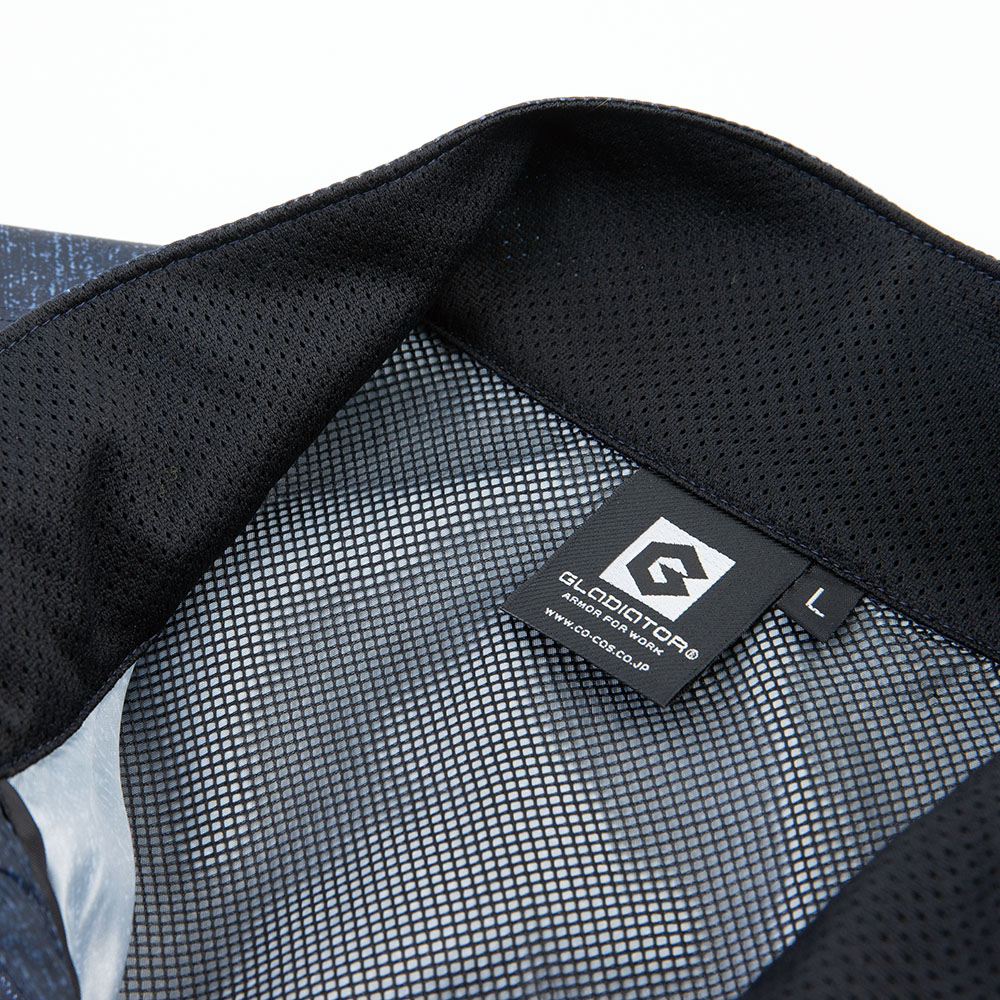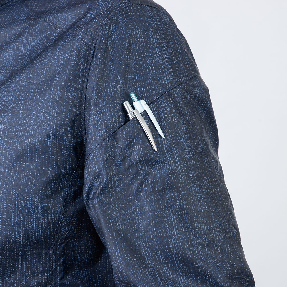 ●衿内側メッシュ付き ●両脇逆玉縁ポケット ●左袖マルチポケット ●裾ストレッチテープ ●袖口シャーリング ●肘部分のゴムが動きをサポート「ムービングギャザー」
