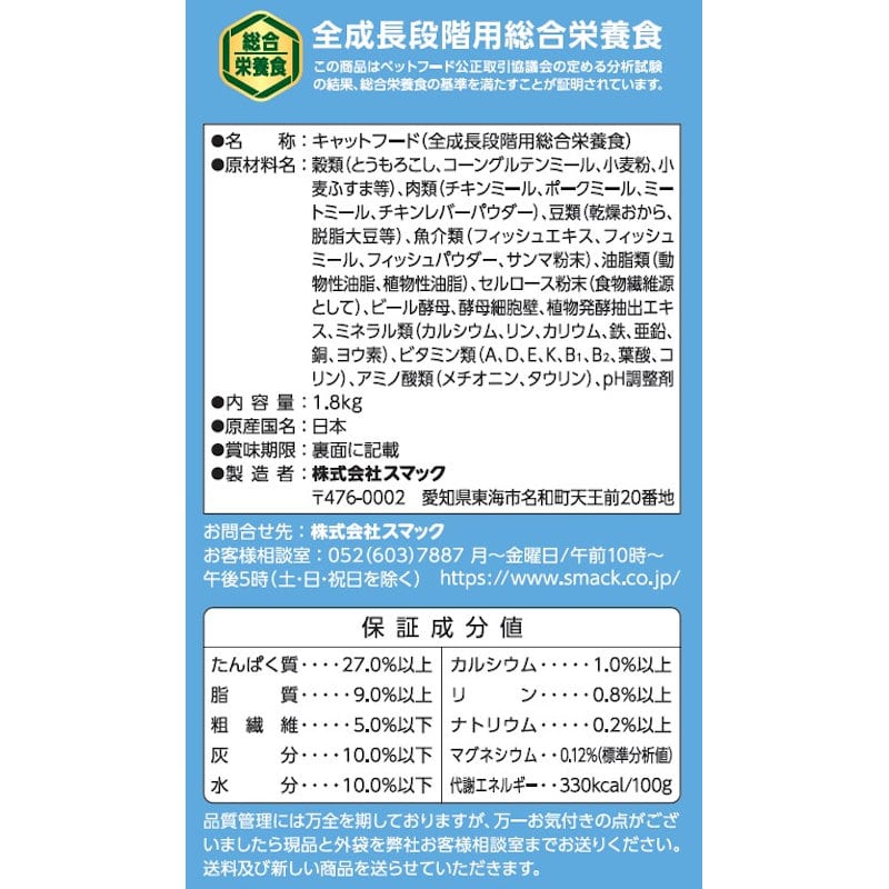 原材料・成分:穀類(とうもろこし、コーングルテンミール、小麦粉、小麦ふすま等)、肉類(チキンミール、ポークミール、ミートミール、チキンレバーパウダー)、豆類(乾燥おから、脱脂大豆等)、魚介類(かつおエキス、フィッシュミール、フィッシュパウダー、サンマ粉末)、油脂類(動物性油脂、植物性油脂)、セルロース粉末、ビール酵母、酵母細胞壁、殺菌乳酸菌、植物発酵抽出エキス、ミネラル類(カルシウム、リン、カリウム、鉄、亜鉛、銅、ヨウ素)、ビタミン類(A、D、E、K、B1、B2、葉酸、コリン)、アミノ酸類(メチオニン、タウリン)、pH調整剤