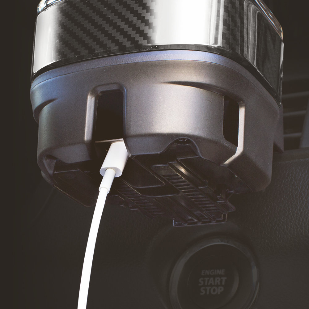 ・横幅が広く、カバー等を装着したスマートフォン(最大幅83mm)でも手軽に置くことができます。 ・エアコンの送風により、ドリンクを保冷・保温する効果があります。 ・取り付けは吹き出し口のフィンに樹脂クリップで挿し込むだけの簡単装着です。 ・スマートフォンを収納したまま充電コードが挿せます。 ・オニキスのようなグロッシースモークと金属調カーボン柄を重ねた高級感あふれるハイクラスボディ。