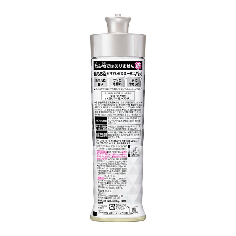 独自の処方で、ベッタリ油汚れも乾いたこびりつき汚れも、細かく分解! 長もち泡が、すすいだ瞬間一気にパッ! 汚れ落ちを指先でキュッと実感。 スポンジ・まな板の除菌*、まな板・食器・調理用具のウイルス除去*(*全ての菌・ウイルスを除去するわけではありません。エンベロープタイプのウイルス1種で効果を検証) 手にやさしい。 クエン酸高配合。無香性。