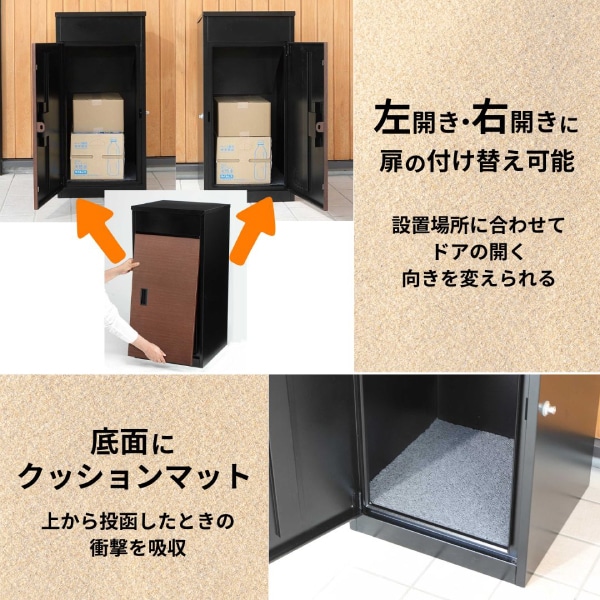 ●宅配物が同時に配送されても安心 大容量でいっぱいになるまで何回でも荷物が入る。 上扉から下扉からで荷物のサイズに合わせて受け取りできる。 ●左開き・右開きに扉の付け替え可能 設置場所に合わせて、ドアの開く向きをかえられるので設置時に困りません。 ●底面にクッションマット 上からの投函した時の衝撃を吸収します。 ●置き配案内のマグネットシート付き ●固定アンカー4本付き しっかり固定、防犯対策にも。 ※設置方法は商品付属の説明書をご覧ください。 【付属品】 ・宅配ボックス本体 (完成品) ×1 ・クッションマット×1 ・鍵×2 ・固定用アンカー×4 ・固定用アンカー 取付穴用キャップ×4 ・スパナ 小×1、スパナ 大×1 ・取扱説明書×1 ・配達員様向けマグネット式プレート×1