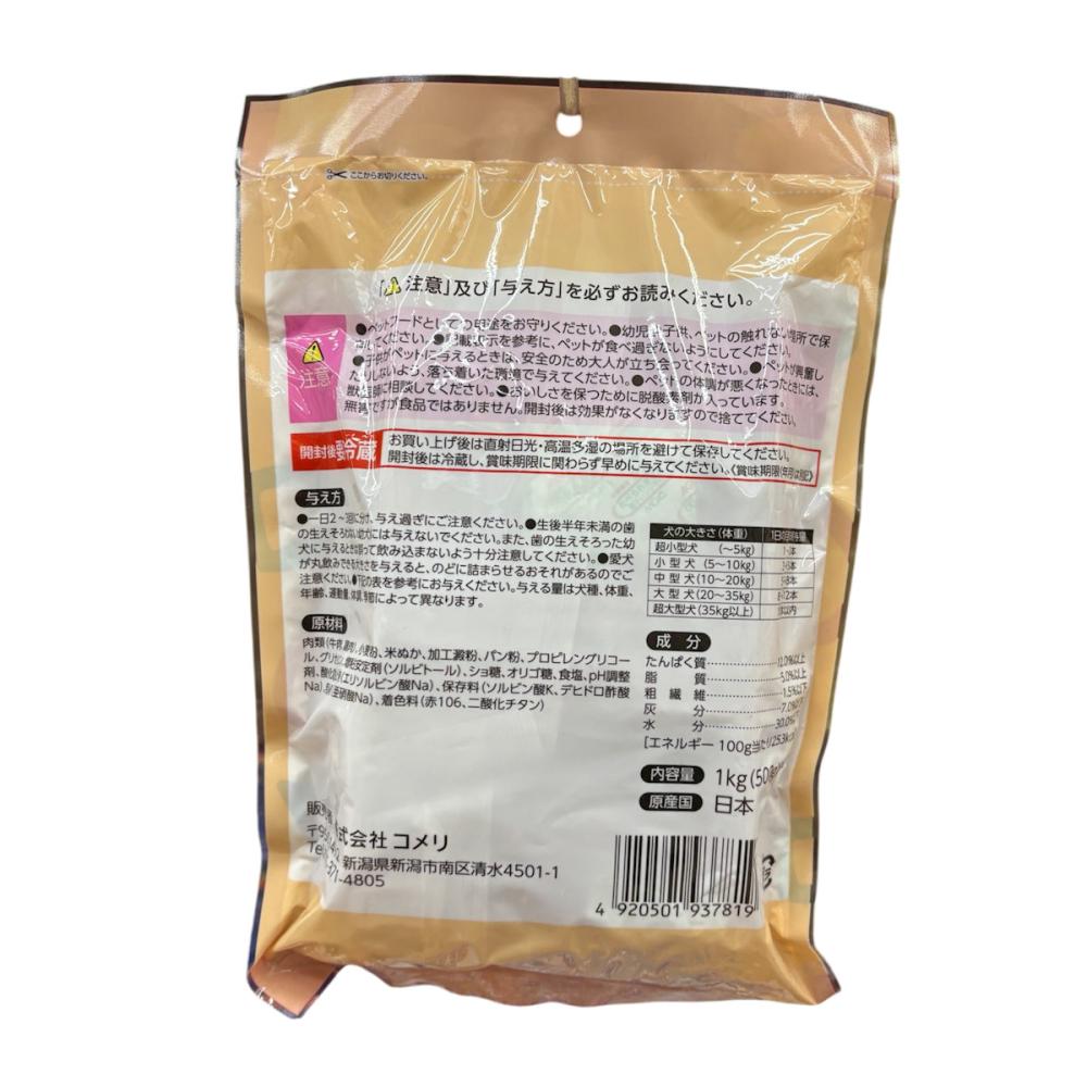 原材料:肉類(牛肉、鶏肉)、小麦粉、米ぬか、加工澱粉、パン粉、プロピレングリコール、グリセリン、増粘多糖類(ソルビトール)、ショ糖、オリゴ糖、食塩、pH調整剤、酸化防止剤(エリソルビン酸Na)、保存料(ソルビン酸K、デヒドロ酢酸Na)、発色剤(亜硝酸Na)、着色料(赤106、二酸化チタン)