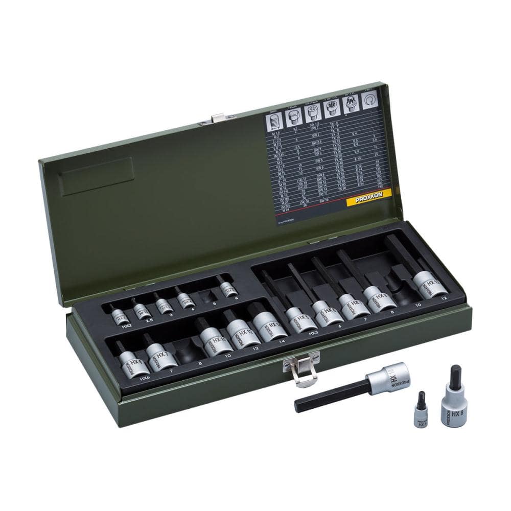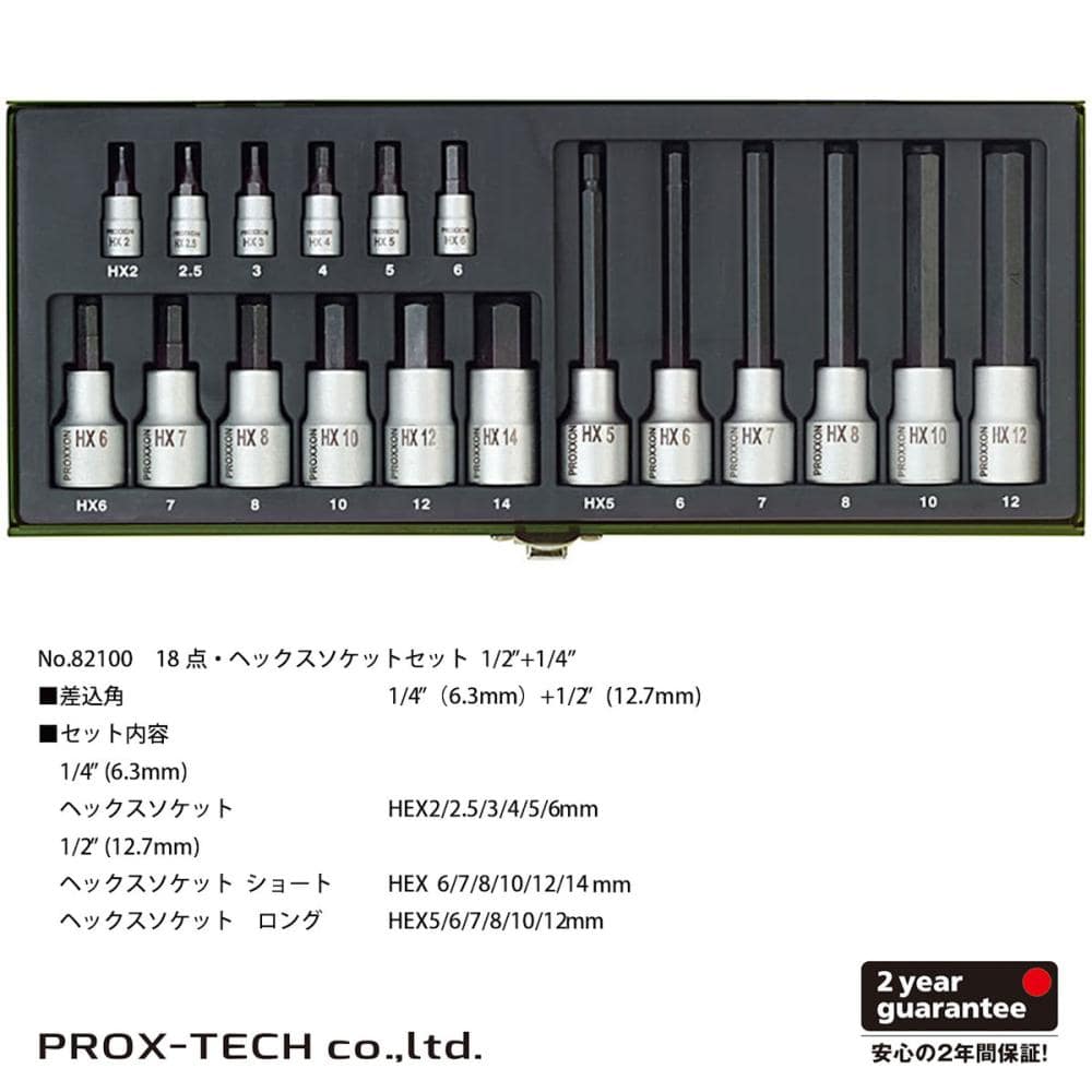 "・ヘックスビットソケット(1/4 6.3mm)HEX2/2.5/3/4/5/6mm ・ヘックスビットソケット(1/2 12.7mm) ショートHEX6/7/8/10/12/14mm ・ヘックスビットソケット(1/2 12.7mm)ロング HEX5/6/7/8/10/12mm ・専用スチールケース 幅330mmx奥行145mmx高さ45mm 総重量2.0kg"