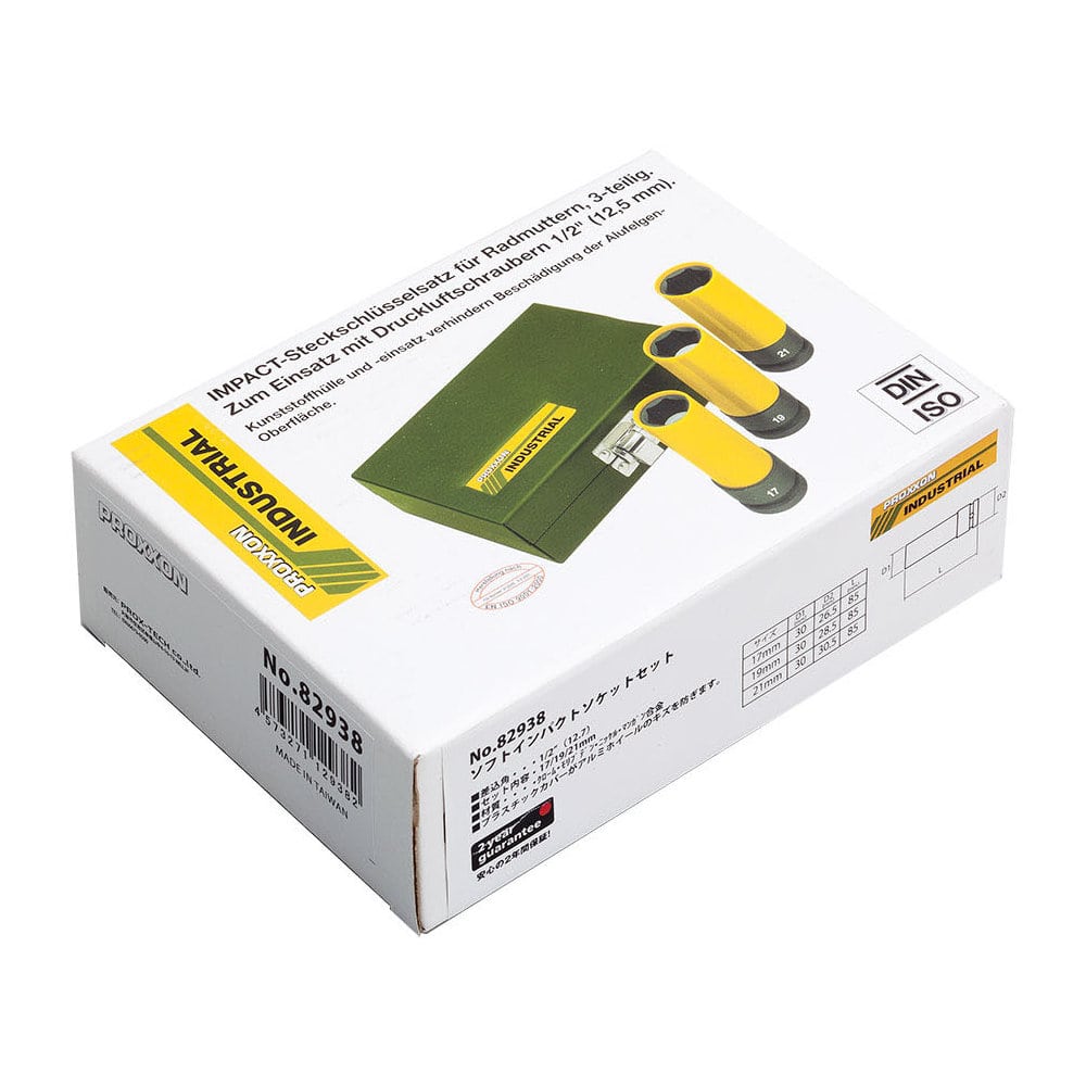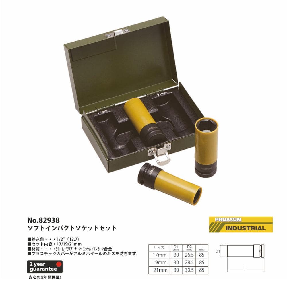 "・ソフトインパクトソケット(1/2 12,7mm)17/19/21mm 長さ=85mm ・プラスチックのソケットカバーが気になるアルミホイールの傷を防ぎます。 ・粘性・靱性に優れ、かつ高トルク・高耐久です(500Nm) ・PROXXON トルクレンチ マイクロクリックシリーズにもご使用いただけます。 ・専用スチールケース 幅155mmx奥行110mmx高さ48mm 総重量1.1kg"