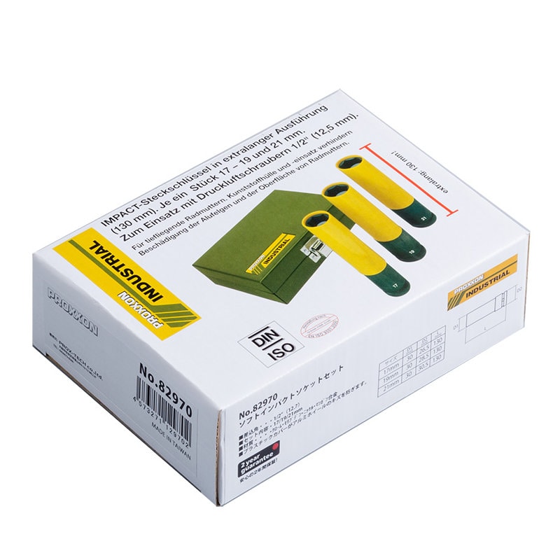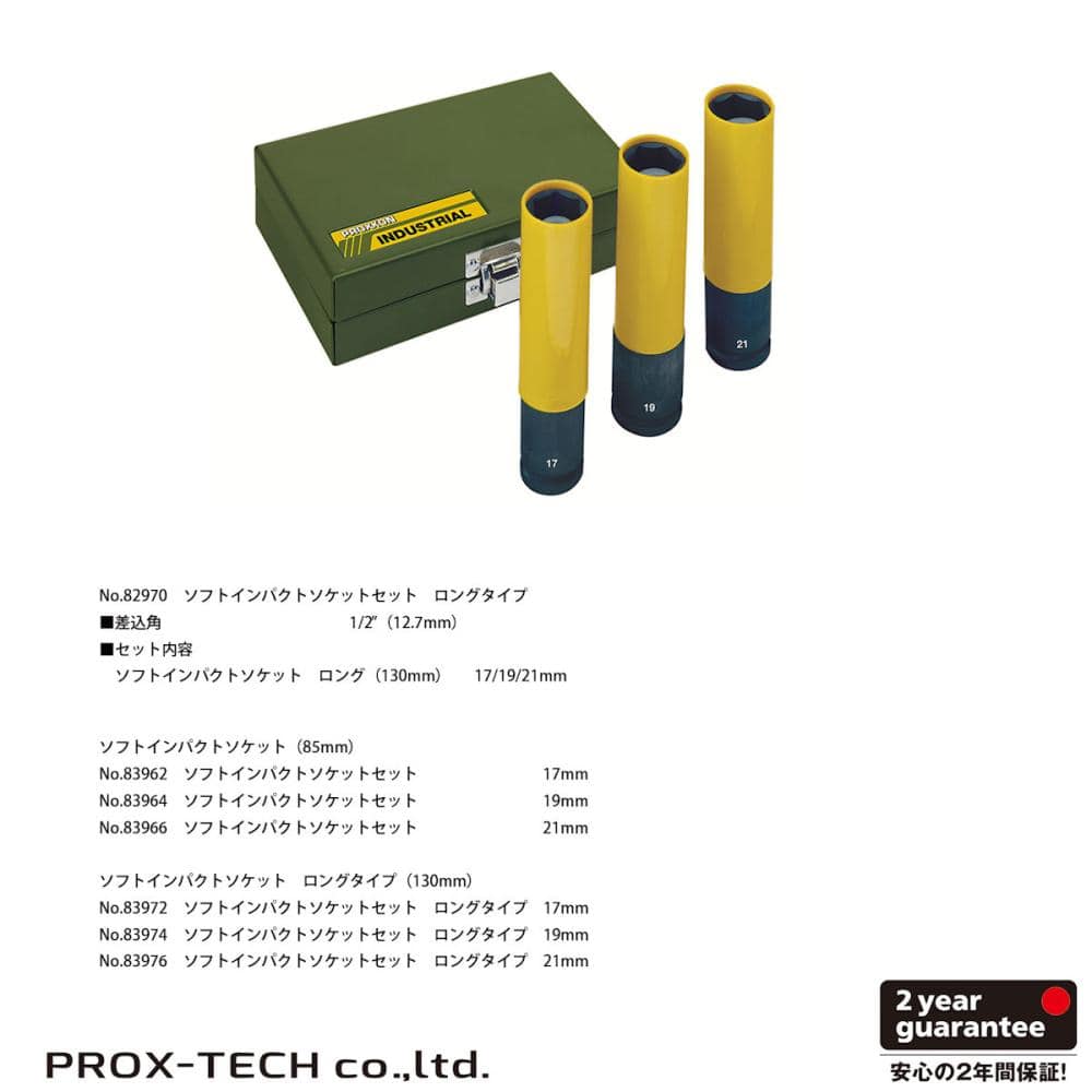 "・ソフトインパクトソケット ロングタイプ(1/2 12,7mm) 17/19/21mm 長さ=130mm ・プラスチックのソケットカバーが気になるアルミホイールの傷を防ぎます。 ・粘性・靱性に優れ、かつ高トルク・高耐久です(500Nm) ・PROXXON トルクレンチ マイクロクリックシリーズにもご使用いただけます。 ・専用スチールケース 幅155mmx奥行110mmx高さ48mm 総重量1.5kg"