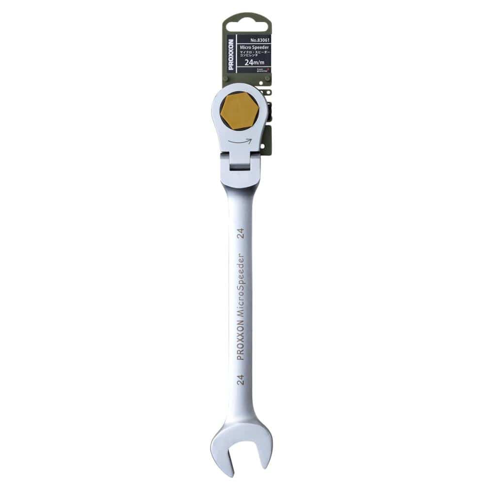 "・サイズ:24mm ・全長=325mm ・ラチェット部幅=47.5mm ・スパナ部幅=52mm ・ラチェット部厚み=11.4mm ・スパナ部厚み=10.5mm ・重量=570g ・送り角度=5°(72枚ギア)"