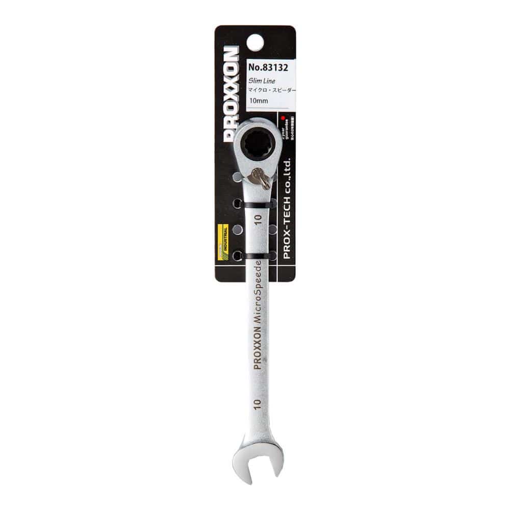 "・サイズ:10mm ・全長=160mm ・ラチェット部幅=21mm ・スパナ部幅=23mm ・ラチェット部厚み=8.3mm ・スパナ部厚み=6.0mm ・重量=60g ・送り角度=5°(72枚ギア)"