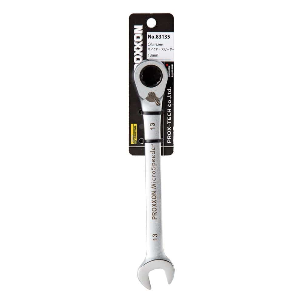 "・サイズ:13mm ・全長=180mm ・ラチェット部幅=26mm ・スパナ部幅=30mm ・ラチェット部厚み=9.0mm ・スパナ部厚み=7.5mm ・重量=106g ・送り角度=5°(72枚ギア)"