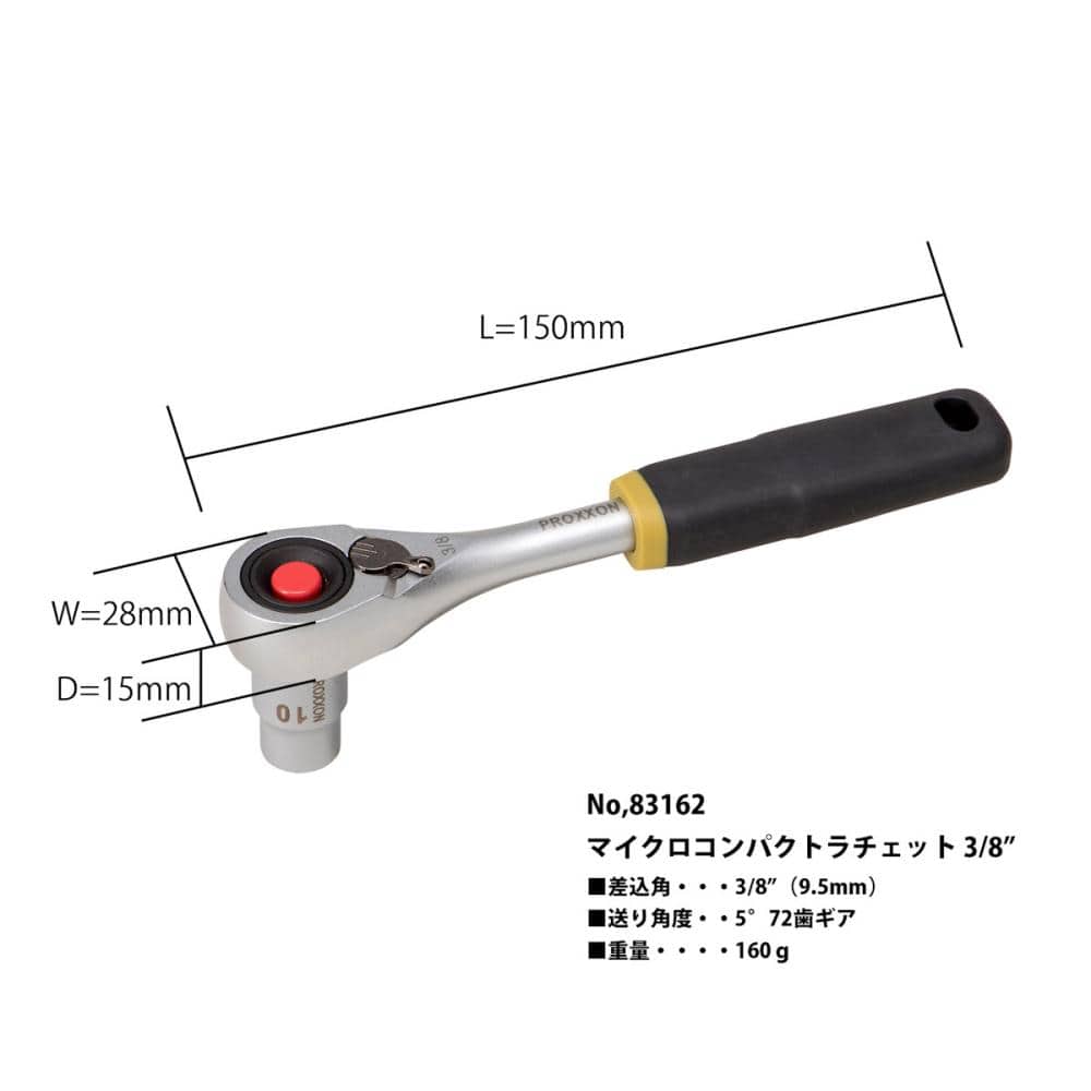 "・差込角:3/8(9.5mm) ・送り角度:5° ・72枚歯ギア ・全長:150mm ・重量:160g ・プッシュリリース付回転方向の切り替えはヘッド上部の切り替えレバーで行います"
