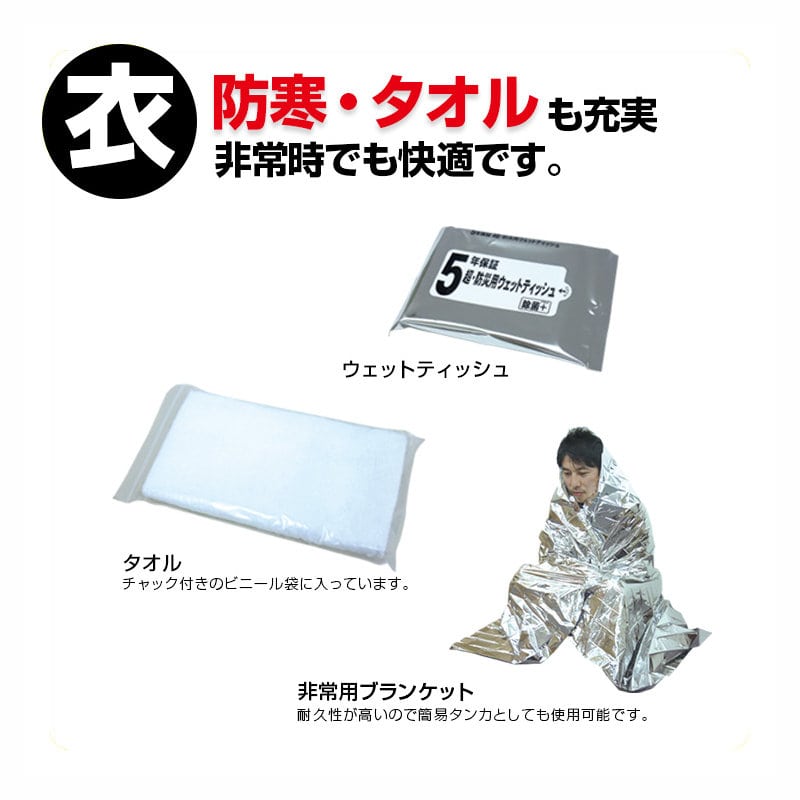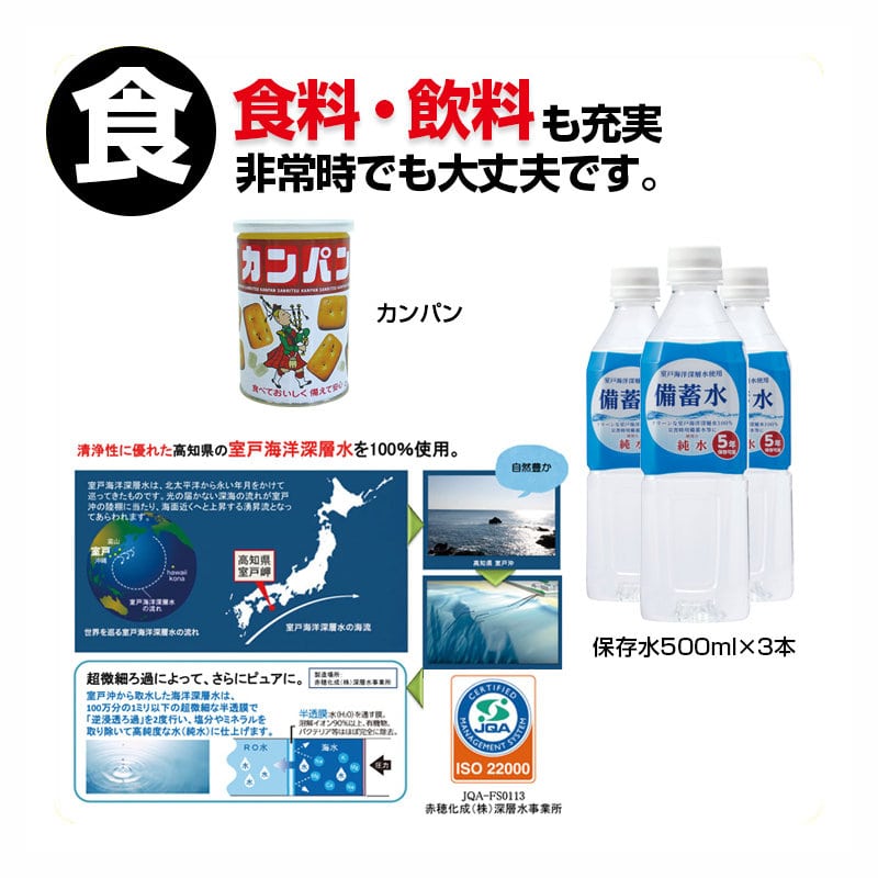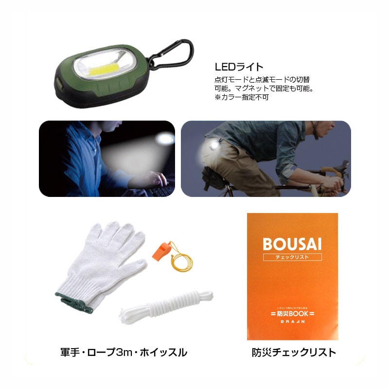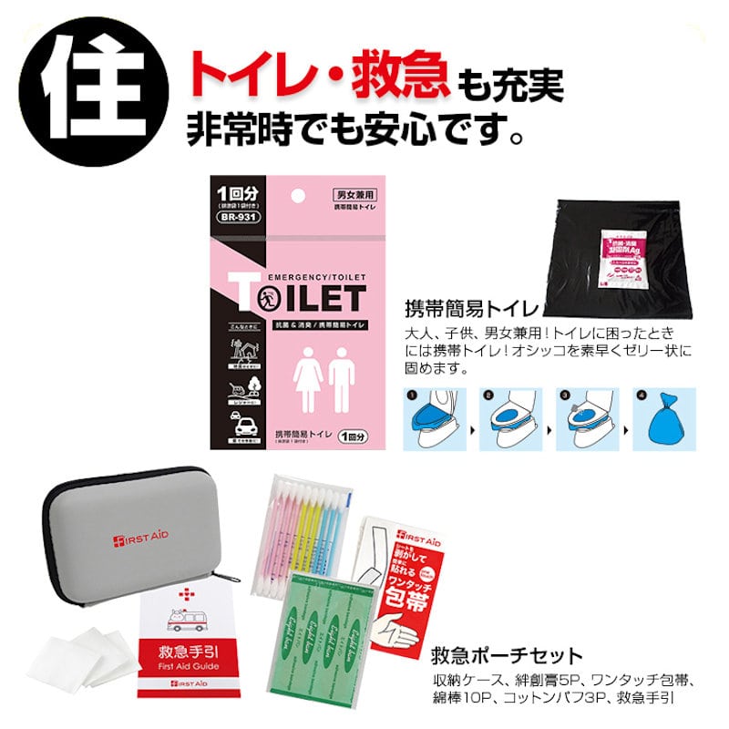 ●緊急時に持ち運び便利な非常用用品を収納したコンパクトサイズの防災セットです。 ●ポーチには名刺サイズの紙が入る透明ポケットが付いています。氏名などを書いた紙を入れて、オフィス等の壁に並べて掛けておけばすぐに持ち出せます。 ●LEDライトは小型なのに明るく高機能。明るさを2段階で調節できる他、点滅モードも兼ね備えています。マグネット付きなので固定して使うことも可能です。 ●抗菌非常用トイレは、銀を配合した抗菌性凝固消臭剤×1個と汚物袋×1袋のセットです。使用後は可燃ごみとして処理できます。 【セット内容】 1、ポーチ 2、カンパン 3、5年保存水500mL 4、LEDライト 5、タオル 6、ウェットティッシュ 7、非常用ブランケット 8、抗菌非常用トイレ(抗菌性凝固消臭剤×1個、汚物袋×1袋) 9、防災チェックリスト 10、軍手 11、ロープ3m 12、ホイッスル ●救急セット 13、収納ポーチ 14、絆創膏 15、包帯 16、コットンパフ 17、綿棒 18、救急手引 ※セット商品は状況によって画像のものと異なる同等品となる場合がございます。