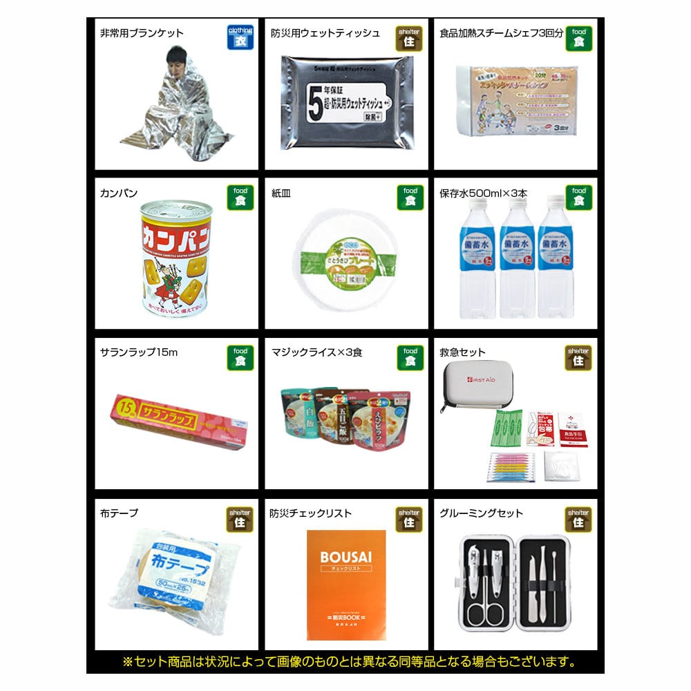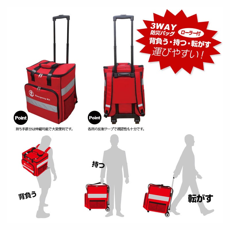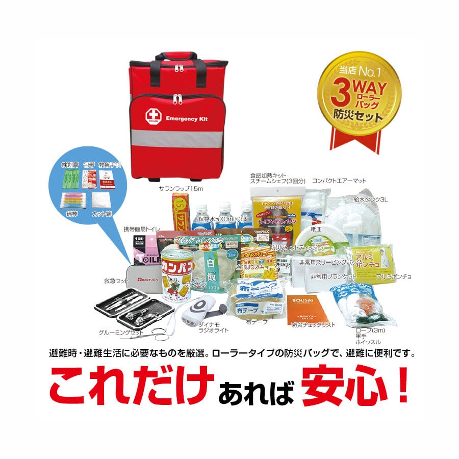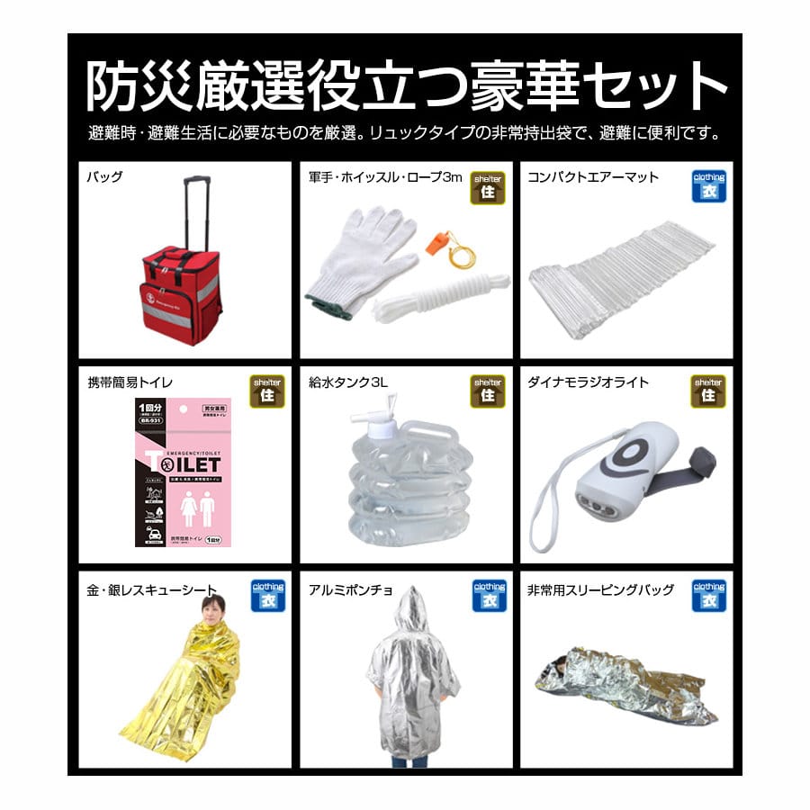 ●ローラー付きバッグで重いアイテムでも運びやすくなっています。 ●外寸:(約)幅380×縦420×高さ430mm(車輪含) ●素材 バッグ:ポリエステル、PE、ステンレススチール、PP、ポリエステル綿 【セット内容】 1、バッグ 2、ダイナモラジオ 3、軍手 4、ホイッスル 5、ロープ3m 6、アルミポンチョ 7、非常用ブランケット 8、給水タンク3L 9、保存水500mL×3本 10、マジックライス×3食 11、カンパン 12、救急セット(収納ポーチ・絆創膏・包帯・コットンパフ・綿棒・救急手引) 13、グルーミングセット 14、スチームシェフ3回分 15、紙皿 16、サランラップ15m 17、布テープ 18、非常用スリーピングバッグ 19、携帯用ミニトイレ 20、レスキューシート 21、防災用ウェットティッシュ 22、コンパクトエアーベッド 23、防災チェックリスト ※セット内容はリニューアル、あるいは在庫状況により写真のものと異なる同等の代替商品に変わる場合がございます。