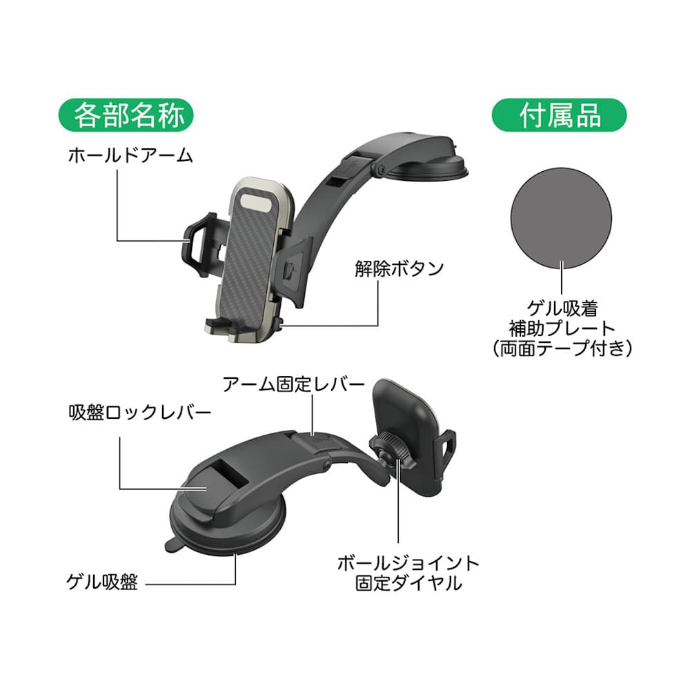 ローポジションタイプの吸盤式マウントパーツ。運転中の視界を妨げにくい低位置へ設置。上下角度調節も可能。