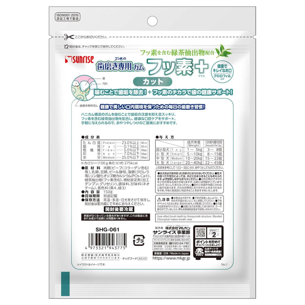 原材料・成分:肉類[ビーフ(コラーゲン含む)等]、乳類、豆類、ビール酵母、藻類(クロレラ等)、リン酸化オリゴ糖カルシウム(POs-Ca)、緑茶抽出物(フッ素含む)、増粘安定剤(加工デンプン、グリセリン)、調味料、甘味料(ネオテーム)、着色料(黄4、緑3)
