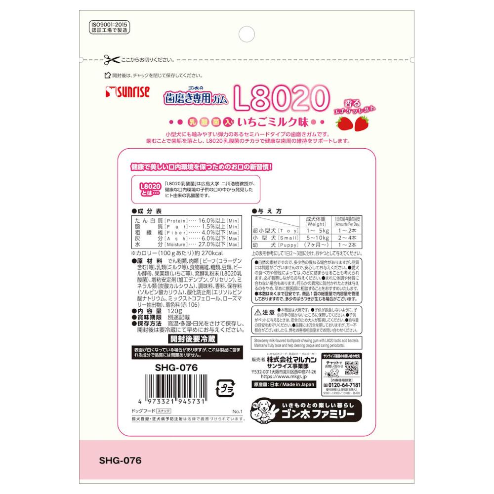 原材料・成分:でん粉類、肉類[ビーフ(コラーゲン含む)等]、乳類(ミルク等)、食物繊維、糖類、豆類、ビール酵母、果実類(イチゴ等)、発酵乳粉末(L8020乳酸菌)、増粘安定剤(加工デンプン、グリセリン)、ミネラル類(炭酸カルシウム)、調味料、香料、保存料(ソルビン酸カリウム)、酸化防止剤(エリソルビン酸ナトリウム、ミックストコフェロール、ローズマリー抽出物)、着色料(赤106)