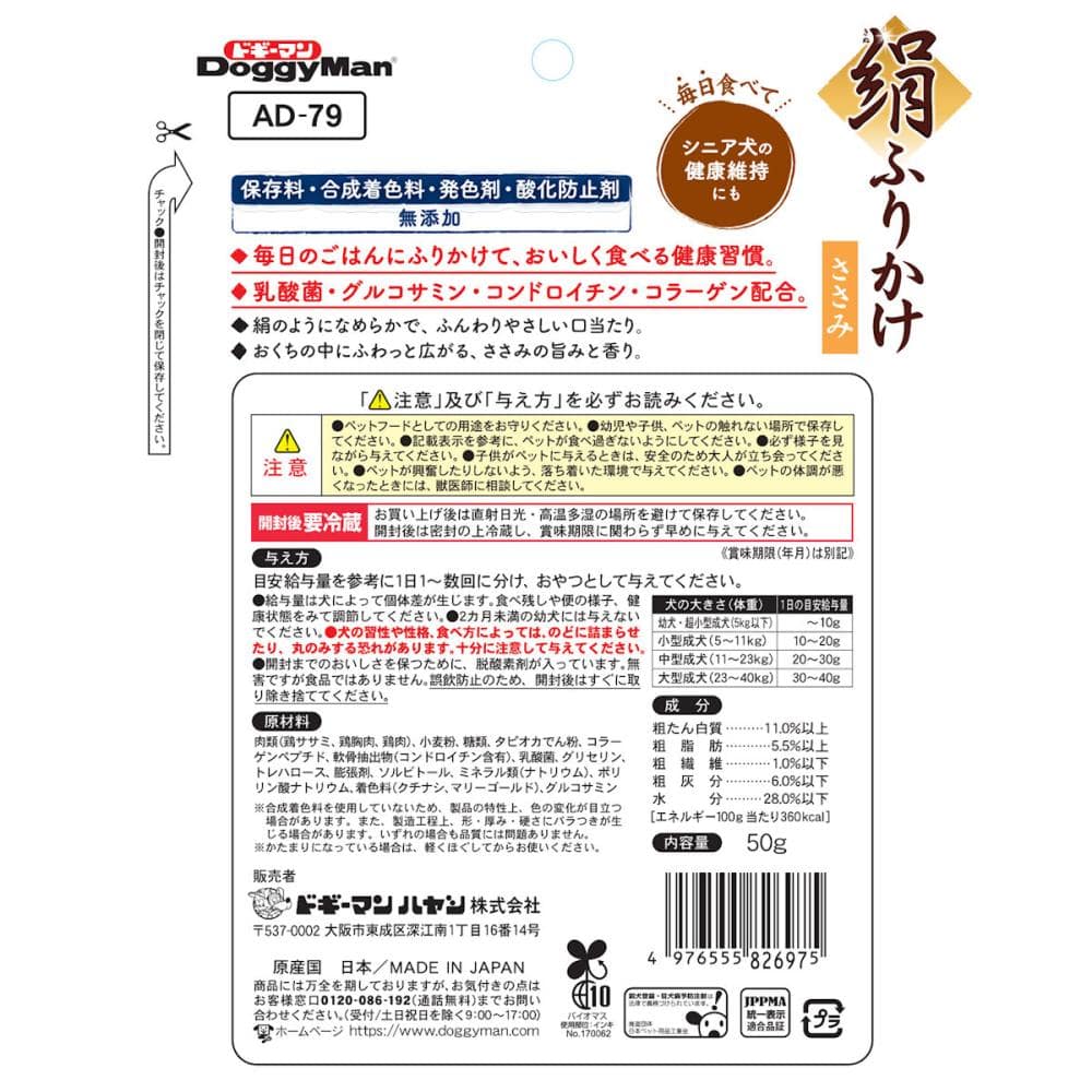 原材料・成分:肉類(鶏ササミ、鶏胸肉、鶏肉)、小麦粉、糖類、タピオカでん粉、コラーゲンペプチド、軟骨抽出物(コンドロイチン含有)、乳酸菌、グリセリン、トレハロース、膨張剤、ソルビトール、ミネラル類(ナトリウム)、ポリリン酸ナトリウム、着色料(クチナシ、 マリーゴールド)、グルコサミン