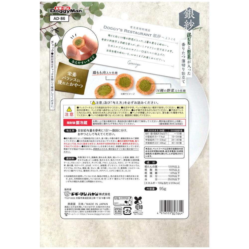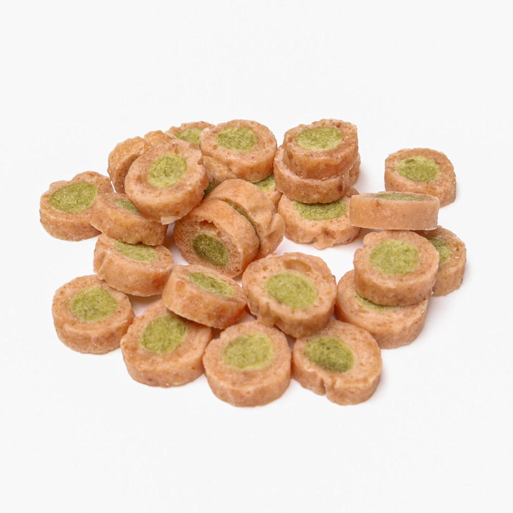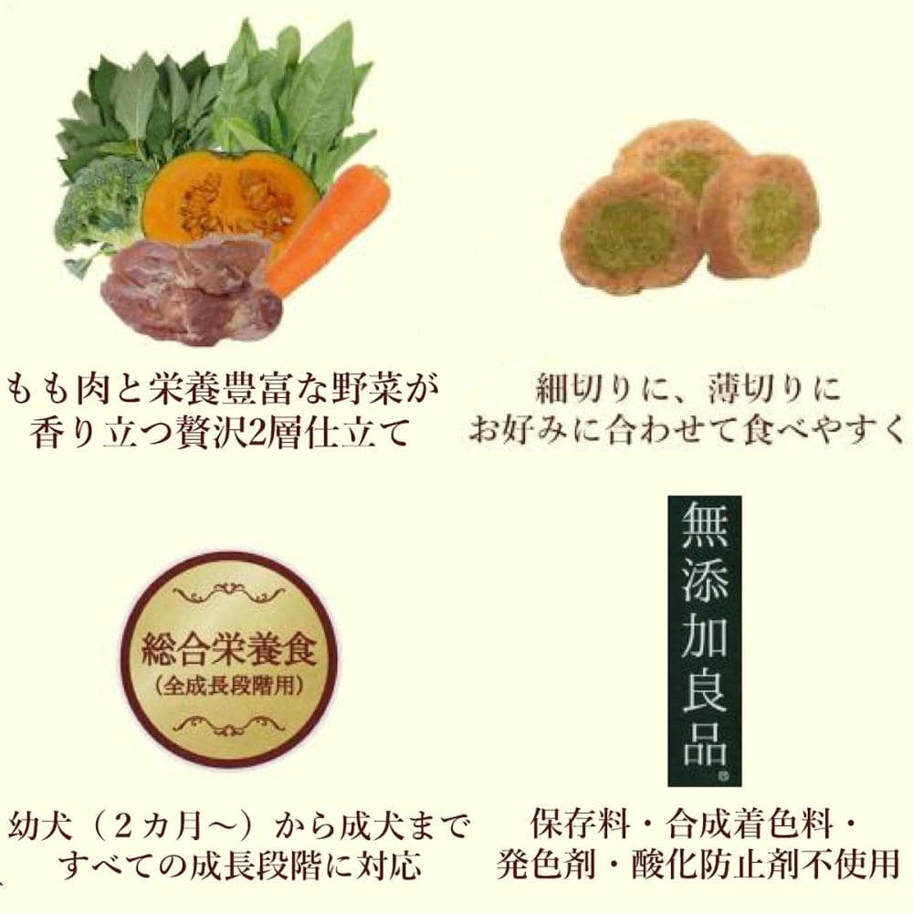 原材料・成分:肉類(鶏ササミ、鶏胸肉、鶏もも肉、鶏肉、鶏レバー)、小麦粉、糖類、タピオカでん粉、ビール酵母、魚介エキス、魚介パウダー、野菜類(大麦若葉、ケール、ブロッコリー、かぼちゃ、チンゲン菜、パセリ、にんじん、セロリ、ゴーヤ、ほうれん草、桑の葉、モロヘイヤ、よもぎ、トマト)、油脂類、グリセリン、ミネラル類(カルシウム、ナトリウム、カリウム、亜鉛、鉄、セレン、銅、ヨウ素)、トレハロース、膨張剤、ソルビトール、ポリリン酸ナトリウム、着色料(クロレラ、クチナシ)、ビタミン類(E、B12、B2、D)