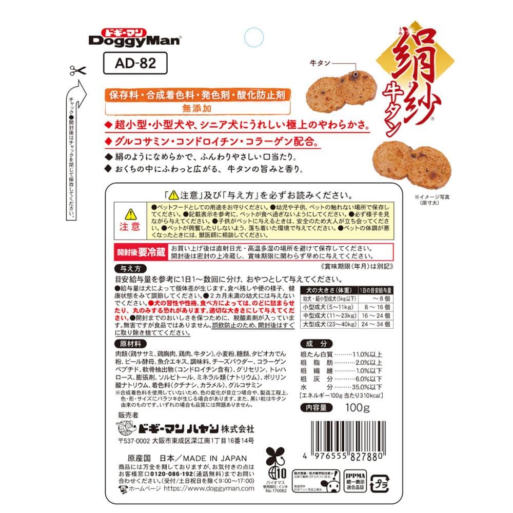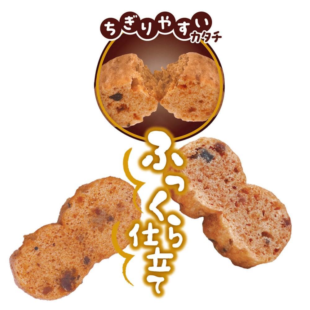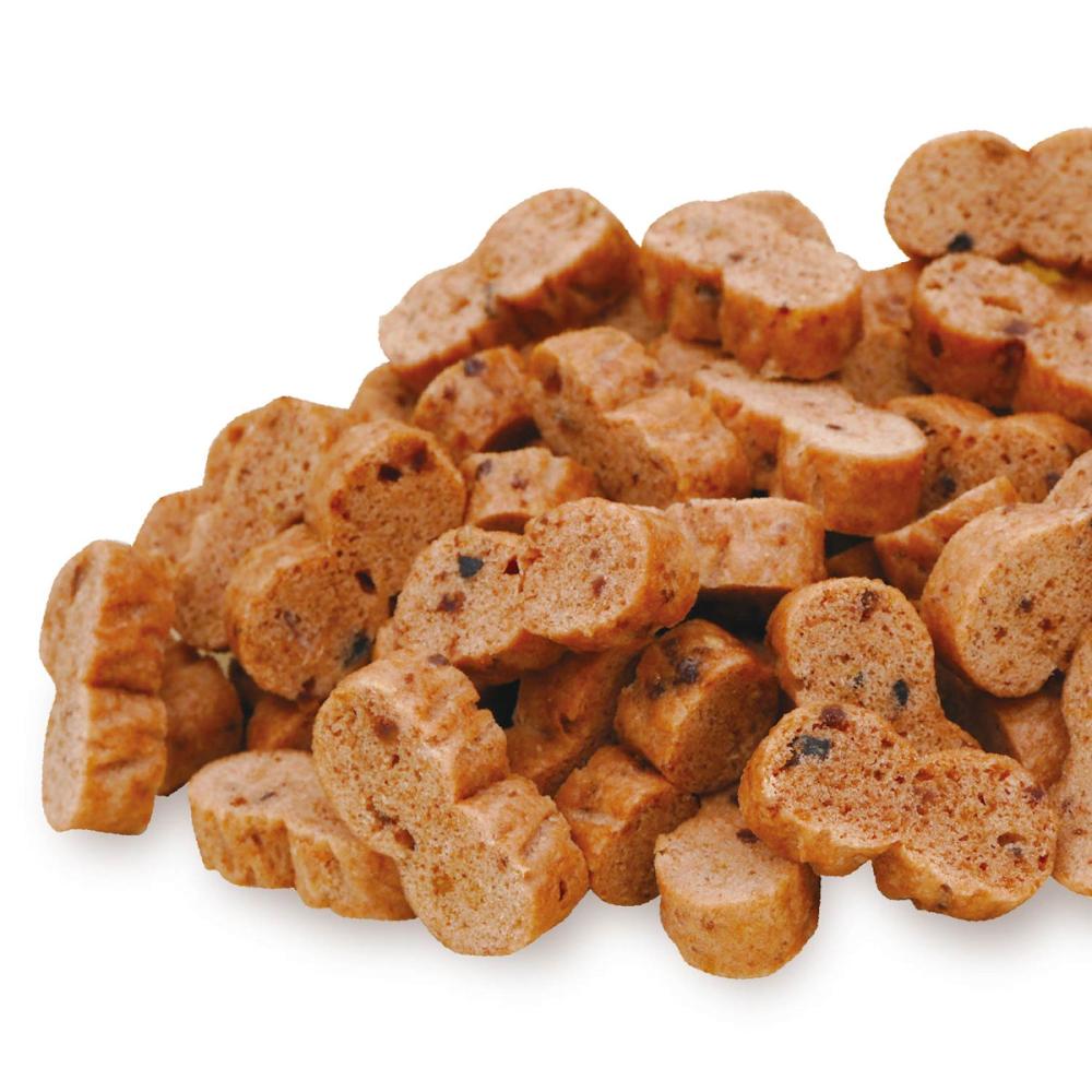 原材料・成分:肉類(鶏ササミ、鶏胸肉、鶏肉、牛タン)、小麦粉、糖類、タピオカでん粉、ビール酵母、魚介エキス、調味料、チーズパウダー、コラーゲンペプチド、軟骨抽出物(コンドロイチン含有)、グリセリン、トレハロース、膨張剤、ソルビトール、ミネラル類(ナトリウム)、ポリリン酸ナトリウム、着色料(クチナシ、 カラメル)、グルコサミン