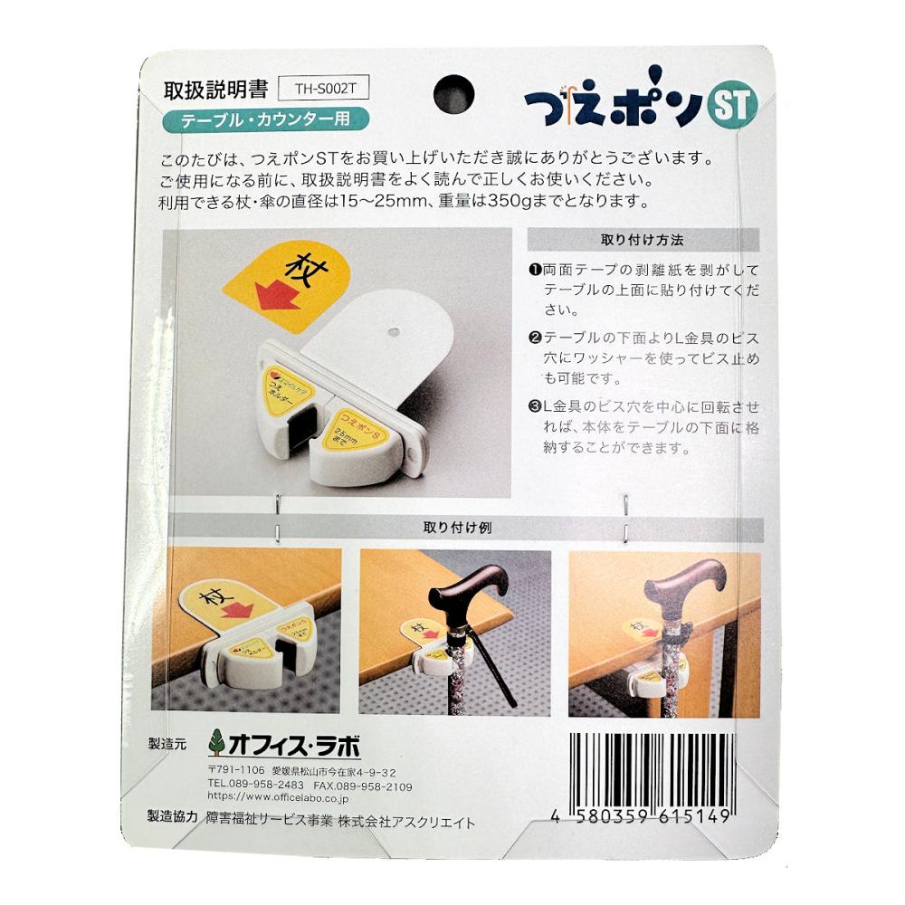 ・バネがやわらかいのでお年寄りにも扱いやすい。 ・杖をしっかり固定してラクに取り外しができる「つえポン」シリーズのテーブル・カウンター用です。 ・取付方法は両面テープ、ビス止めが可能(ビス取付用隠し穴があります)。 ・使用可能な杖の太さ:Φ15~25mm ・付属品:L金具・ビス×2・ワッシャー×2
